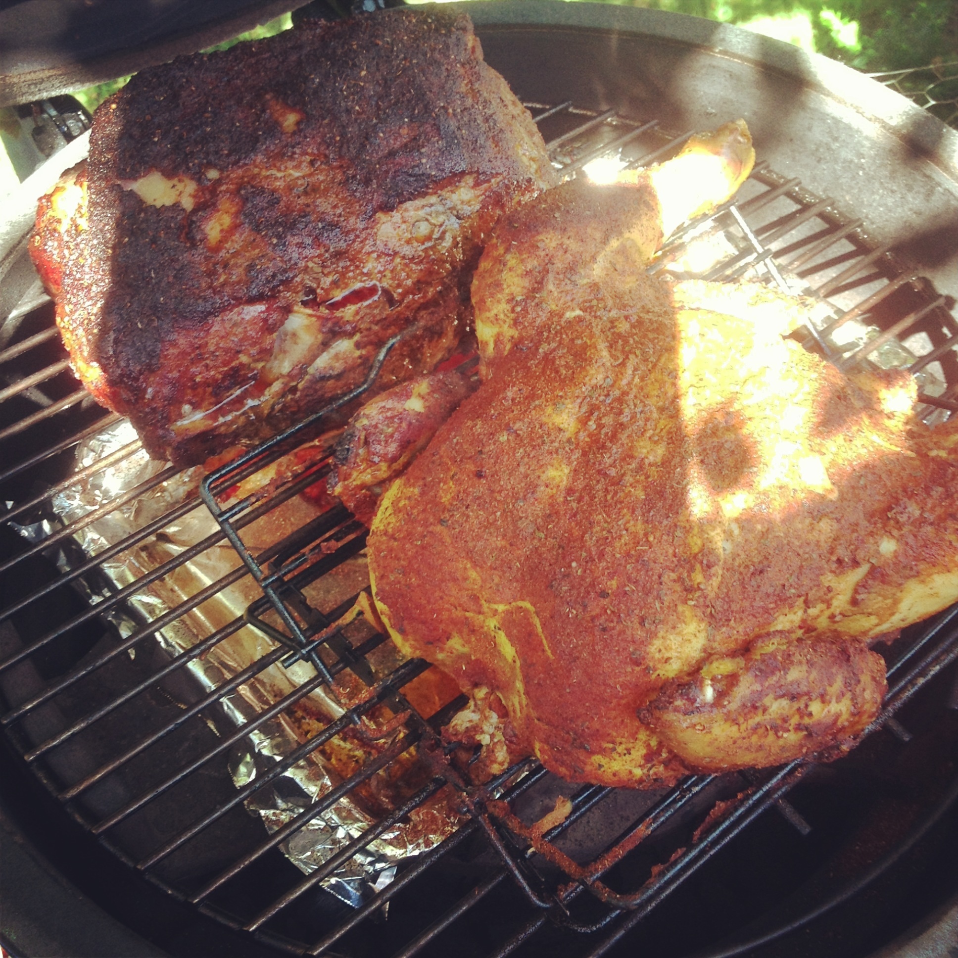 Up for espresso at five, had the LBGE rolling and at 250 at 6, and tossed the butt on. Added the chicken at 9. Chased the temp from 220 to 280 on the dome all morning, but things were going well.