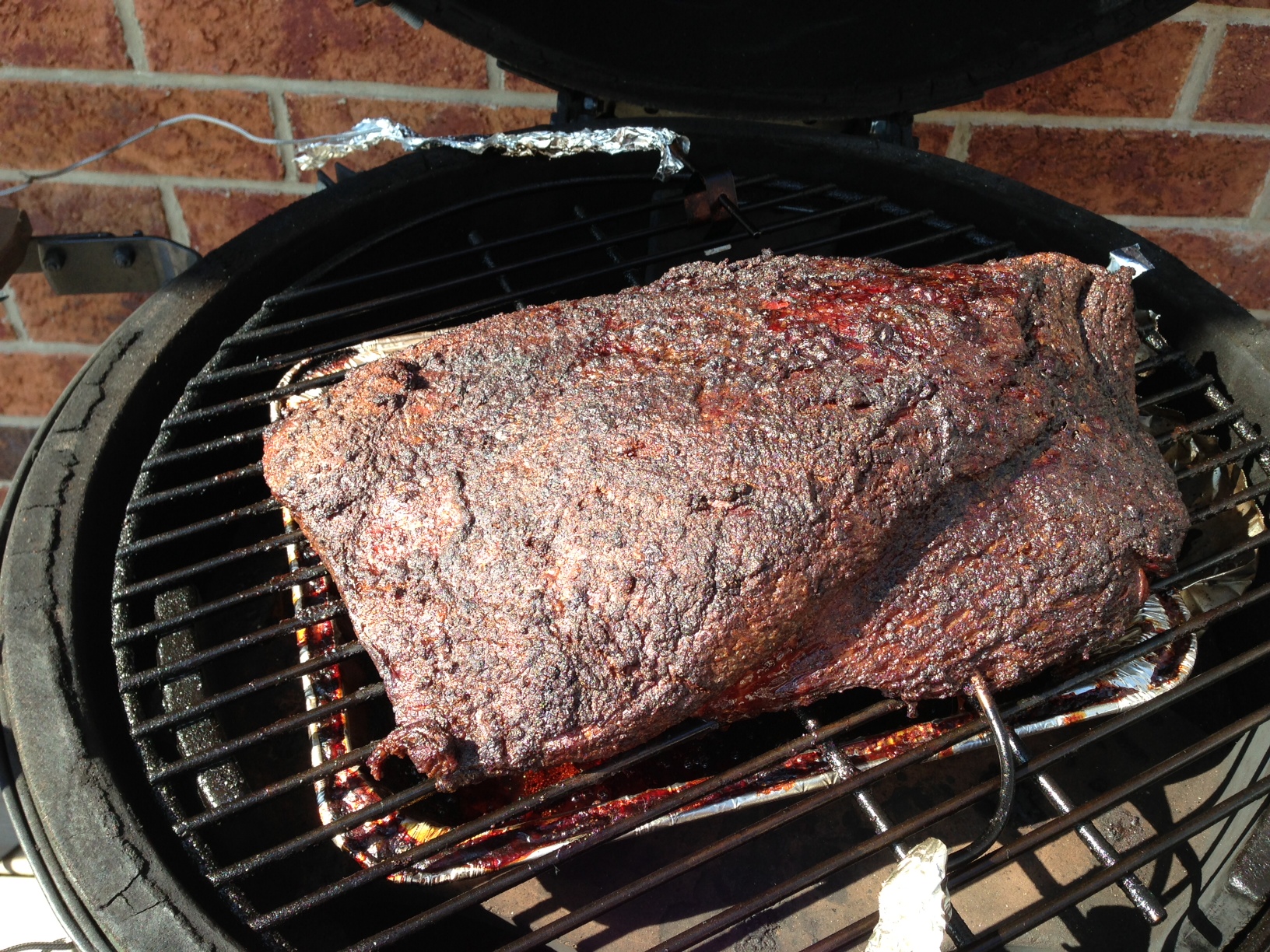 that looks awesome. one quick note- your temp probe is in the point in that picure. The point will generally read hotter than the flat since there is more fat (fat cooks faster than muscle). you'll have a more accurae picture of what's happening with your cook if you measure in the flat.Keepin' It Weird in The ATX FBTX