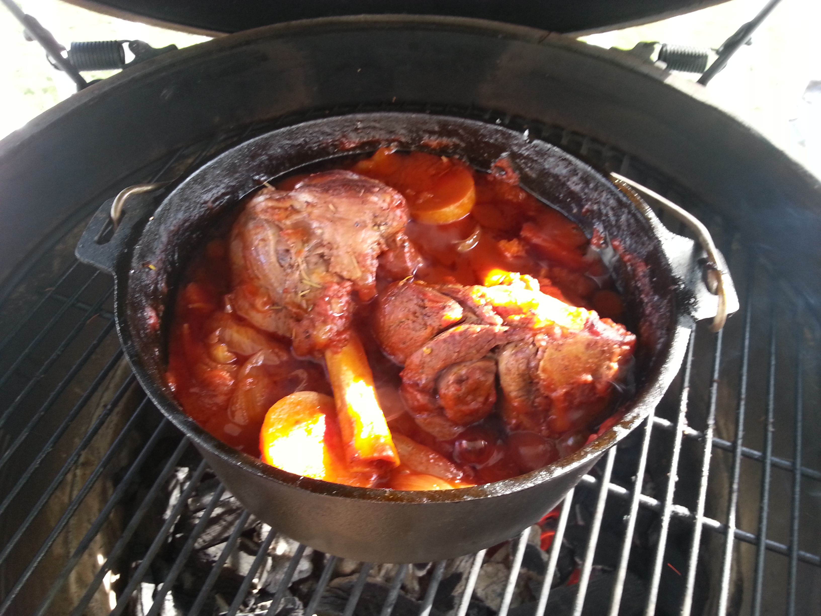 @Springram I am largely following the advice posted by Little Steven yesterday. Coated the lamb with a mix of EVOO, garlic, parsley rosemary, kosher salt, black pepper. Seared the lamb in the dutch oven first, then moved to the grill. After browning, moved off the grill back to the pan. Added a mix of chopped celery, carrots, onions, and a half bell pepper to the dutch oven and sautéed. Then added some tomato paste. Then added 1C each of Chicken Stock/Beef Stock/Red Wine. I have a mix of root vegetables in there the lamb is resting on, onions, carrots, turnips, potatoes. My first time doing this one, so we'll see. Oh, I am holding the temp around 300*.They/Them