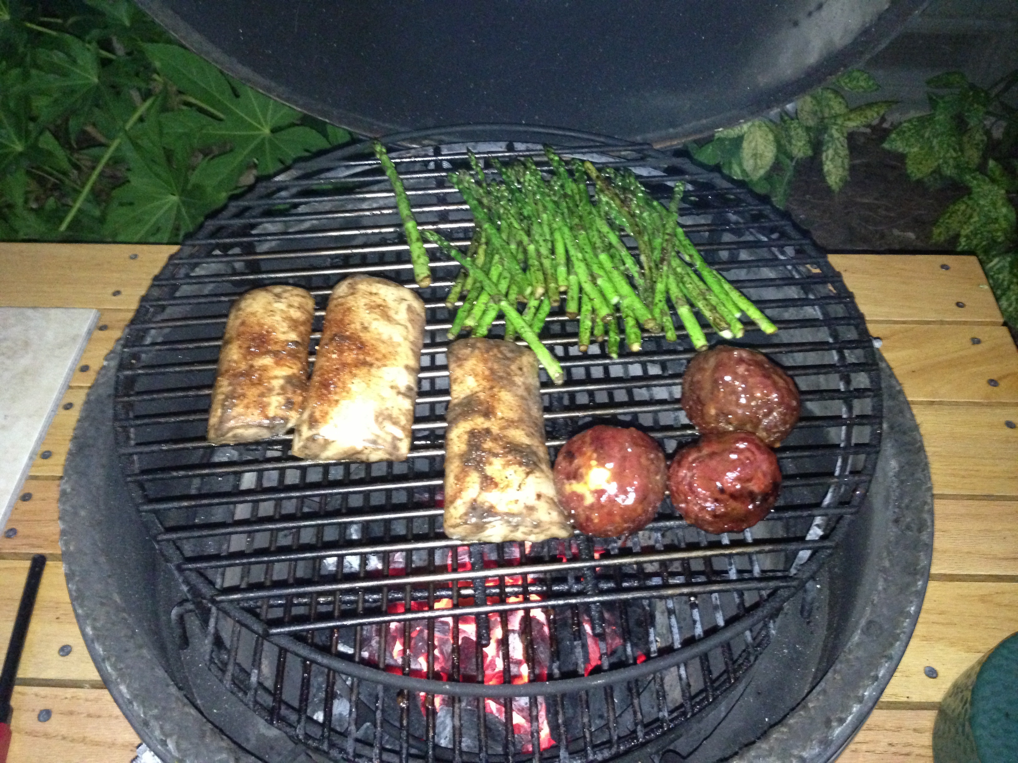 As for the Venison Pimento Cheese balls, I had some left over ground venison and some venison breakfast sausage from the weekend. Mixed both meats together and had some frozen hatch chili pimento cheese balls in the freezer. Wrapped the meat around and threw them on at around 400. I kept mopping them with bone sucking sauce through the whole cook.