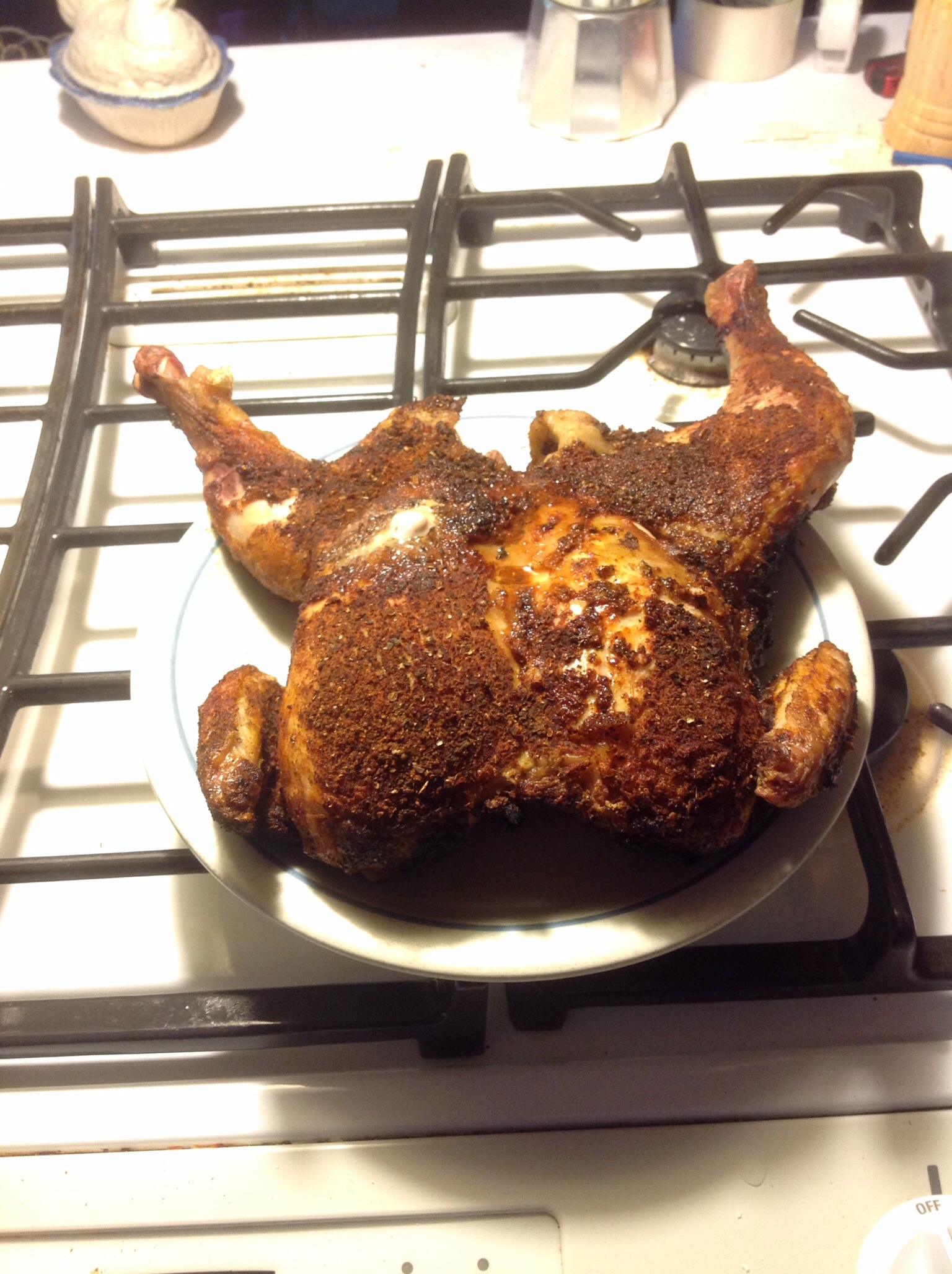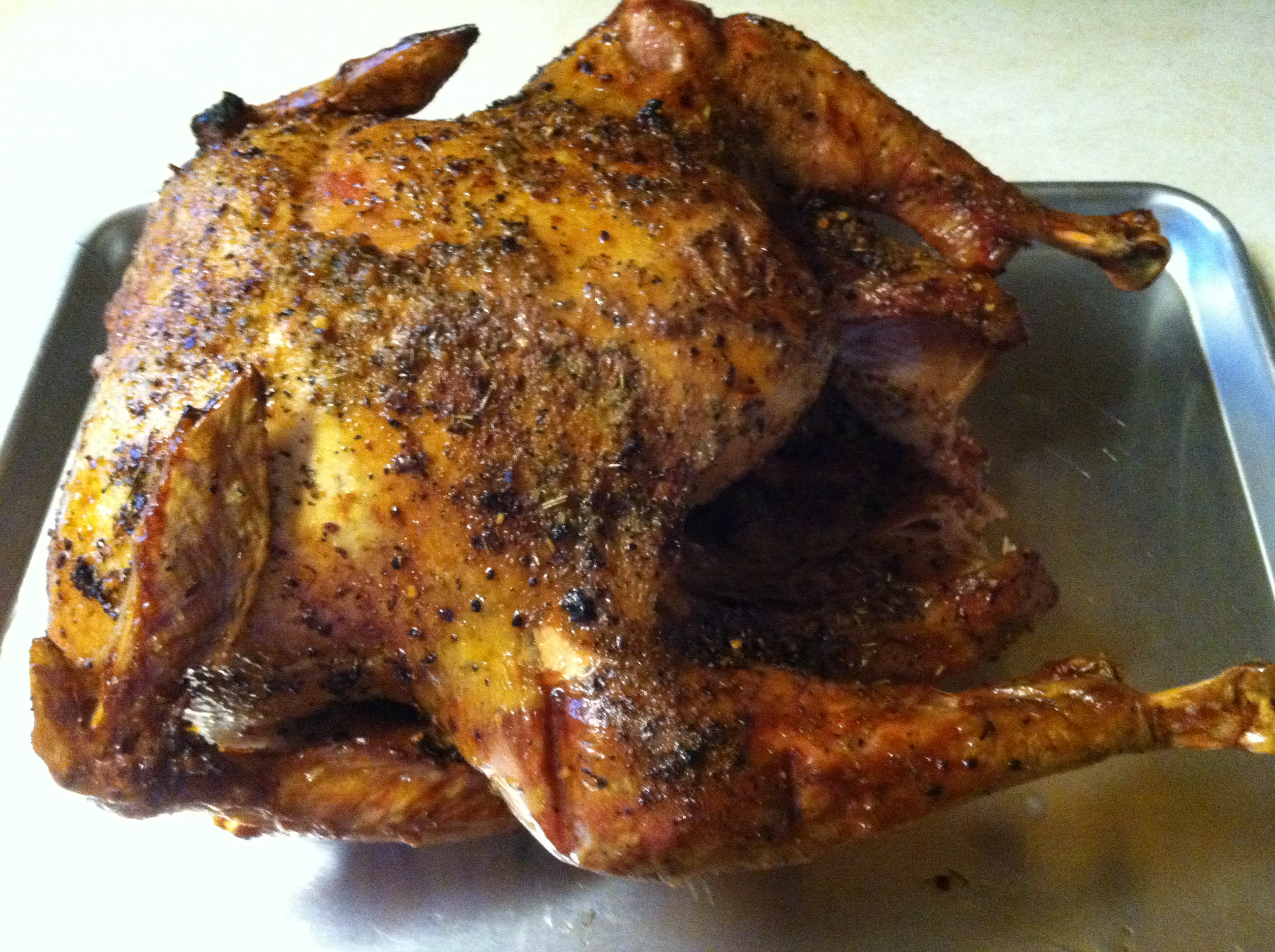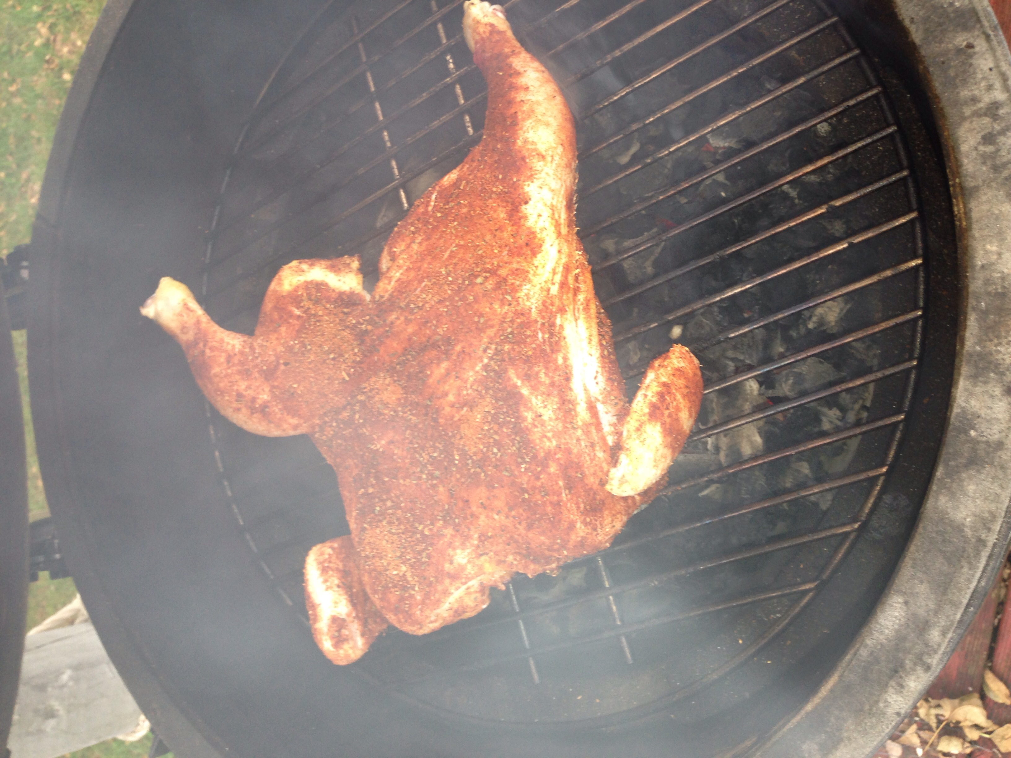 Sprinkled rub with no mustard on the bird and let it come up to temp for a half hour, then on at 375 ish direct to 165/175 (thermapen ftw).
