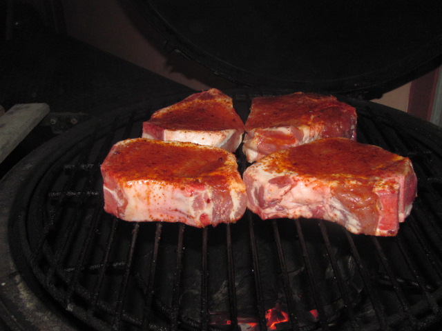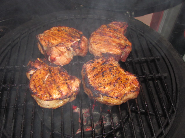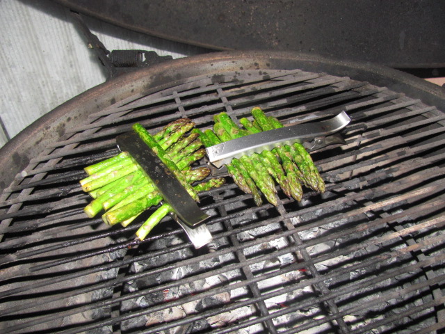 Chops done direct, raised grid at 400 until the internal was 130. Asparagus done direct at 350 for a few minutes.