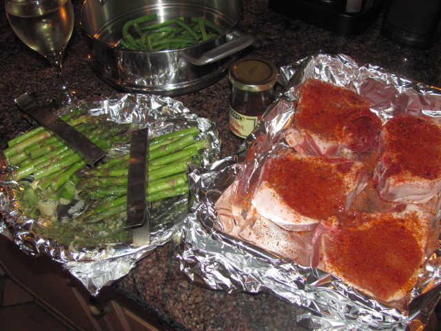 Nice chops, dusted with Bone Sucking Sauce, asparagus marinated in watered down salad dressing, and sun dried tomatoes.