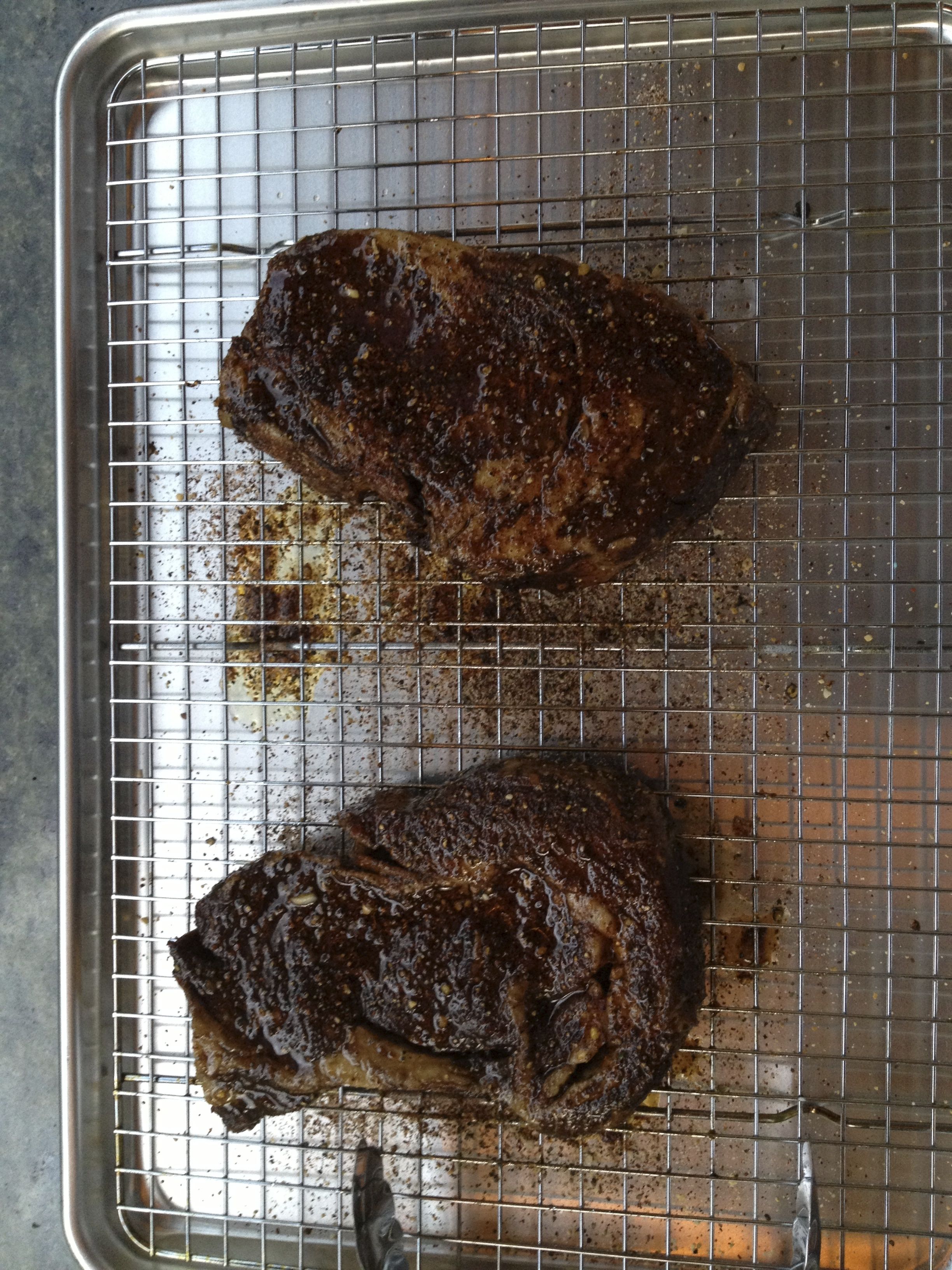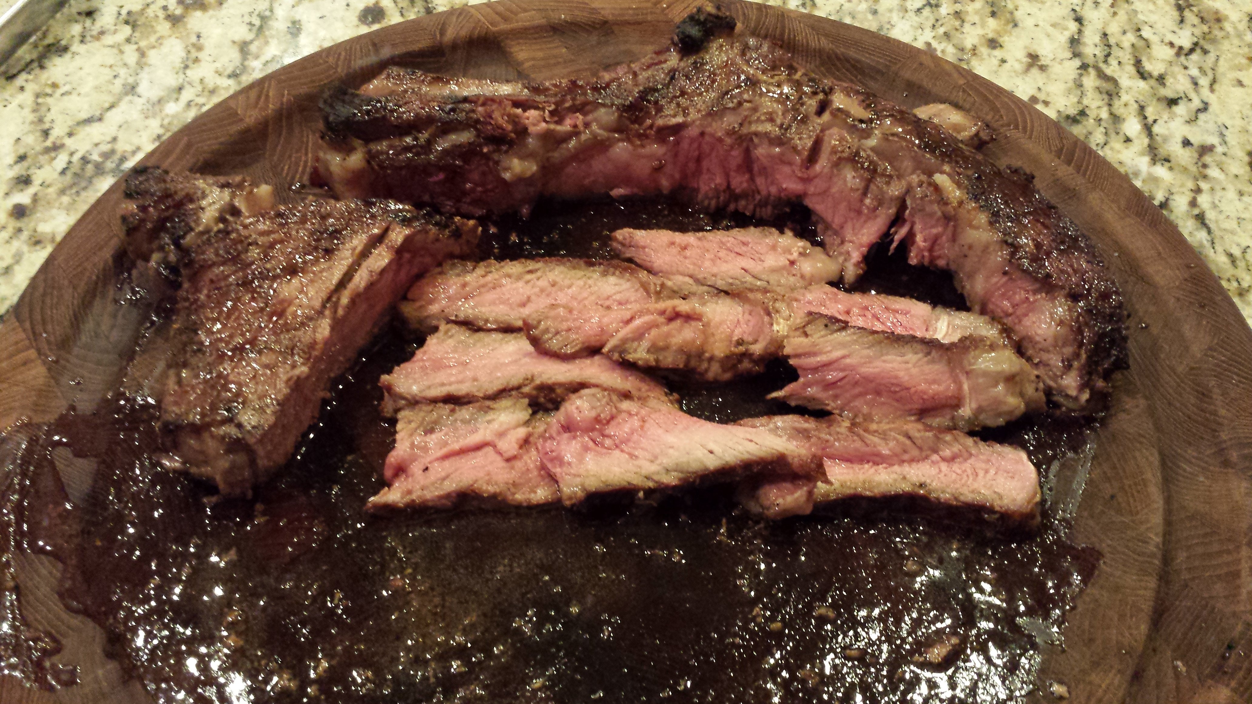 I meant to attach some photos. The first three are a reverse sear cowboy ribeye (~2 inches) and the last two are the APL recipe. The steaks are thinner. The ones on the rack are post marinade, and the steak on the board is pre-slicing in the board sauce.