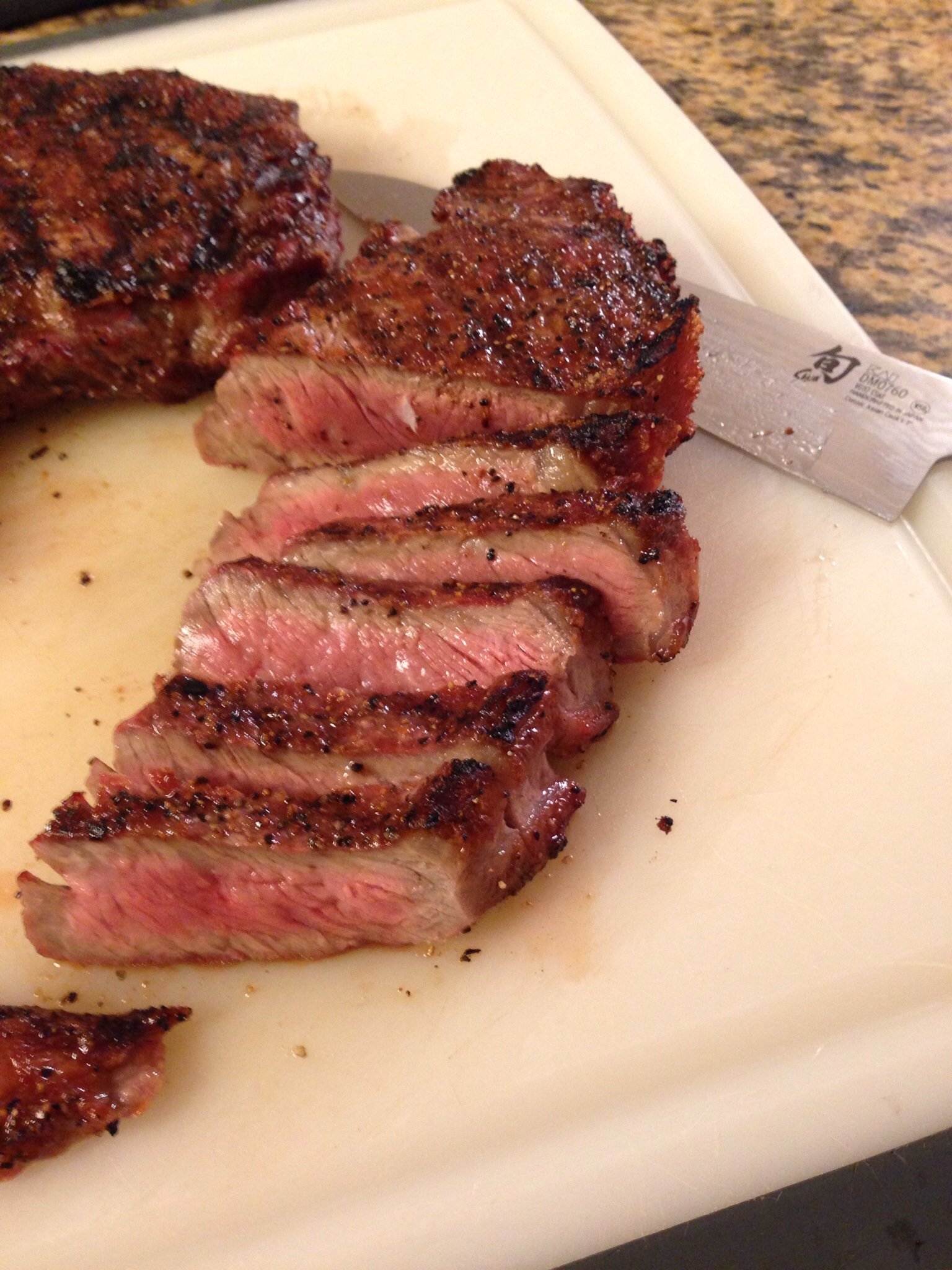 These Costco steaks, I went back to just kosher salt and fresh ground pepper, and went heavy with it. I took them up to just over 135F, then seared them, then plated and covered with foil for 10 minutes. I was happy with the result. She didn't complain.