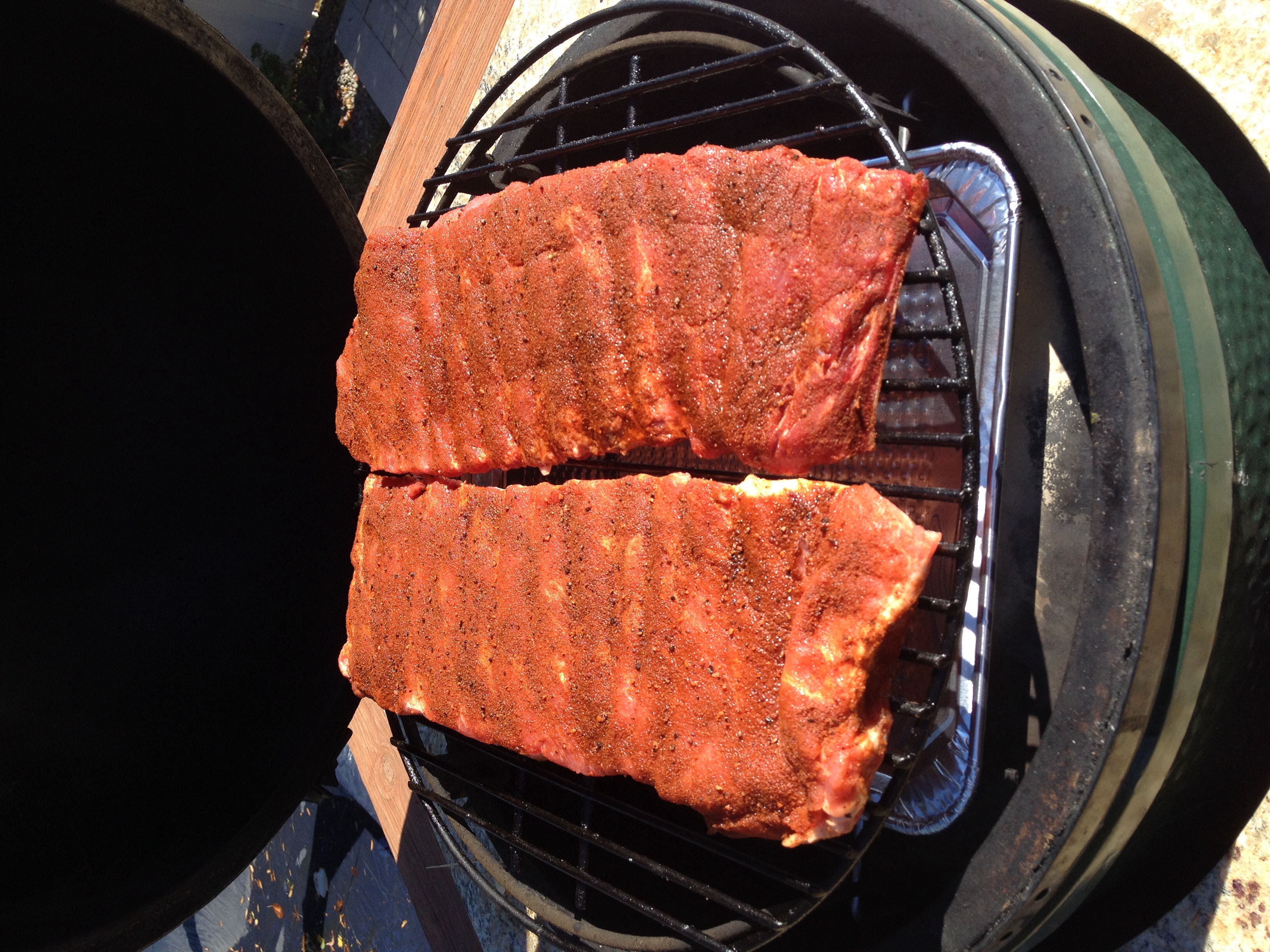 So found a nice 2 pack rack of St. Louis ribs. Rubbed them down at 6:30 am this morning. Just put them on the egg at 200 aiming for 250 for 3 hours. Then I will foil them for an hour then back on the egg naked until they pass the bend test.
