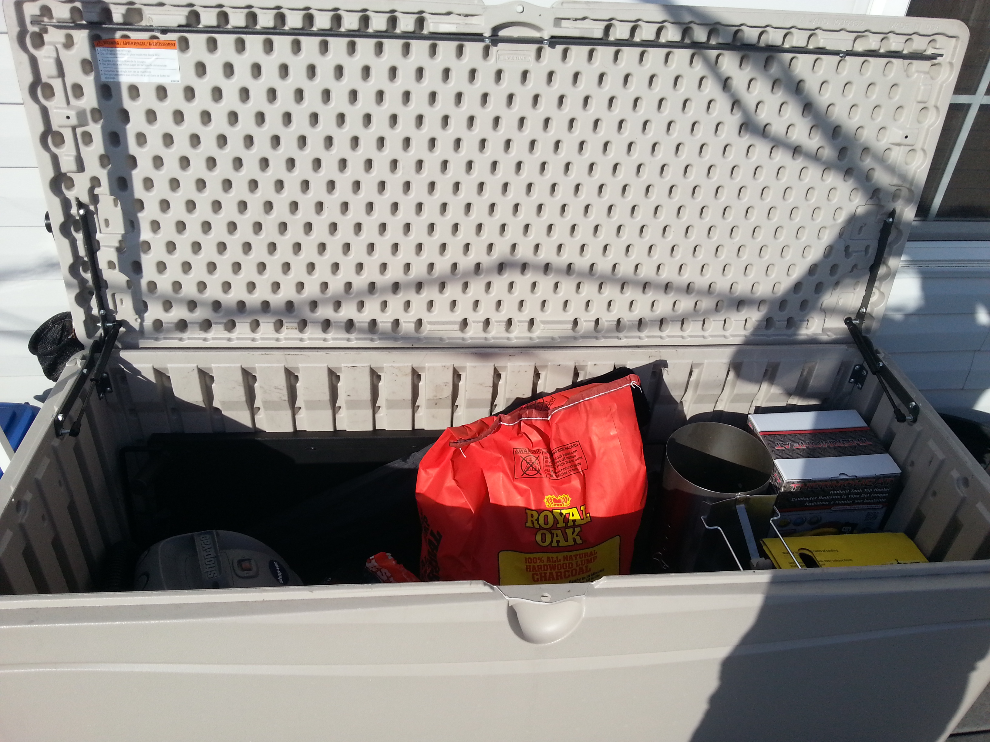 Since I bought my Egg, its been stored in a cypress table inside my garage, and only rolled outside when in use. I just built a house and decided to store the egg and table on my deck, right off the kitchen. however, even with Rubbermaid totes, everything in my table is getting dirty and wet everytime it rains. I think my only solution maybe a deck box, but I'm unsure if I can store lump in there also??? I prefer to not have to tote dirty things through the house every time I use the grill, most often 3 to 4 times per week. If any of you use a deck box to store your eggcessories, do you have a recommendation of a brand or model?