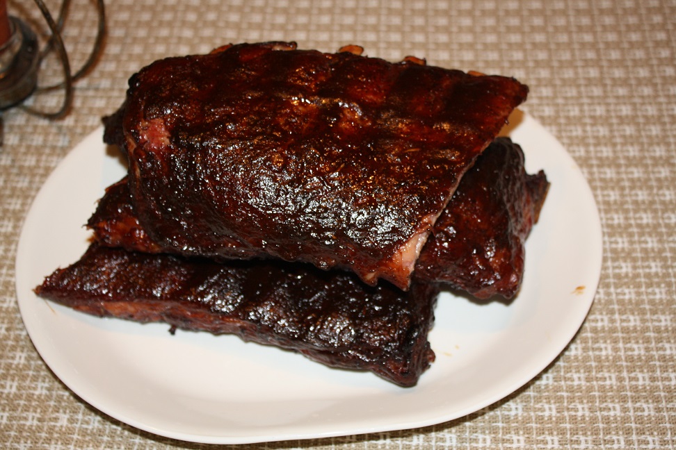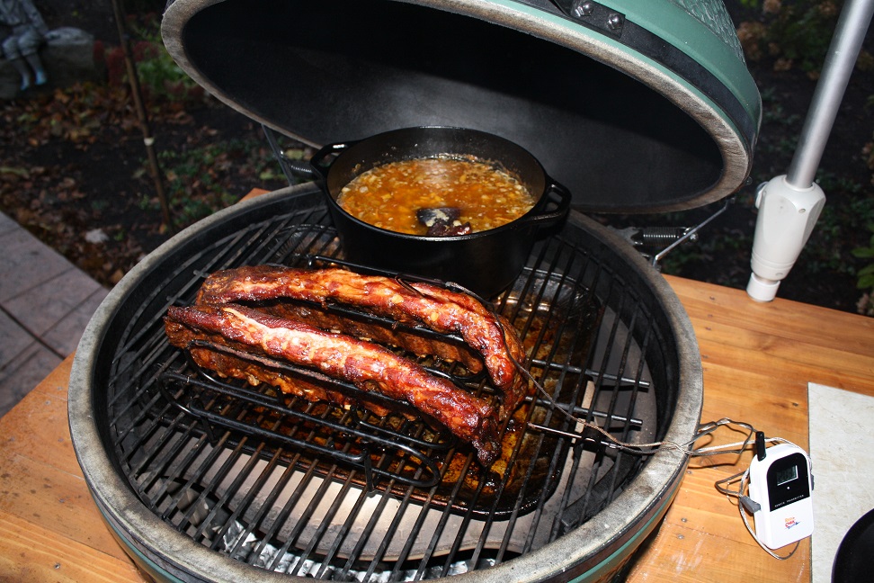 I had this planned for a couple of days. Unfortunately the forecast for mixed clouds and sun turned into an all day rain. No reason to change the menu though. 2 racks of St Louis ribs and a a pot of beans, topped of with the skillet chocolate chip "cookie" found on the forum. I did not have the right size skillet so used an 8 x 8" steel pan, great results.
