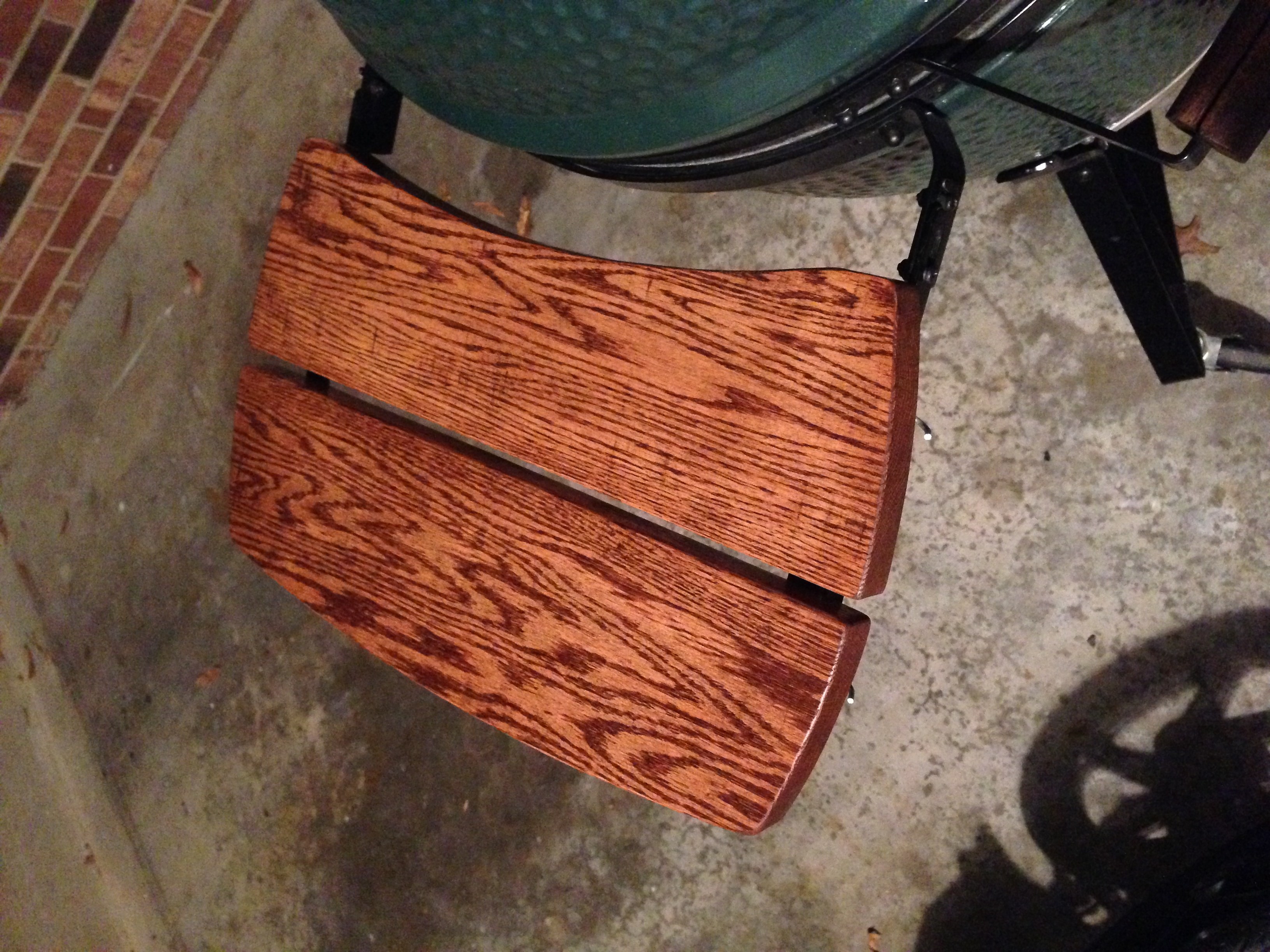 Well, I have been wanting a table for the egg but just can't quite justify one right now. So I got to thinking what could I do to beef up my nest with side shelves. I have never really cared for the thin cedar shelves that came stock on my egg so, I decided to make some new ones!  My dad is a master carpenter and always has some wood laying around. I picked up a board of White Oak, traced the old shelves and cut new ones. I sanded and rubbed them with tung oil. I know they aren't going to last forever in the rain, but my egg lives indoors and only occasionally gets caught in the rain during a cook.  All I have is a free board , oil and a few days invested in them anyway.  Here is what It looks like with the new shelves. I think it turned out pretty good!