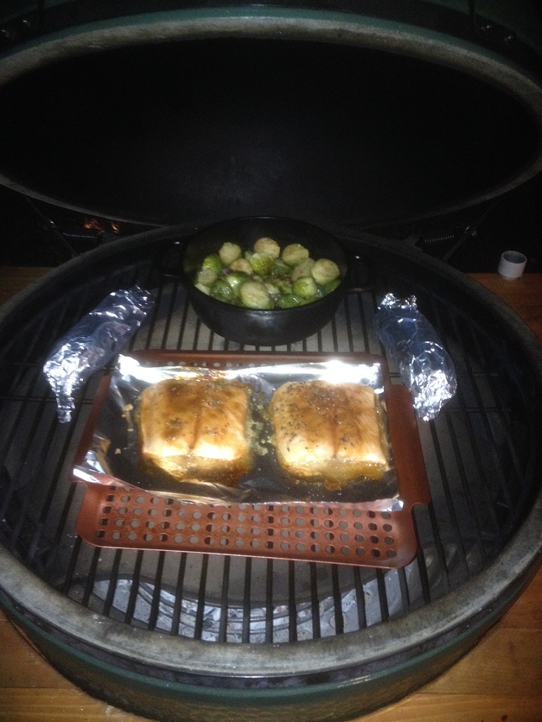 Busy day today, got the yard totally winterized. Roasted Brussels sprouts in a small dutch oven, a couple of sweet potatoes (started in the microwave) and 2 salmon fillets. Plenty of room on the XL! Note Salmon is not as big as it looks.