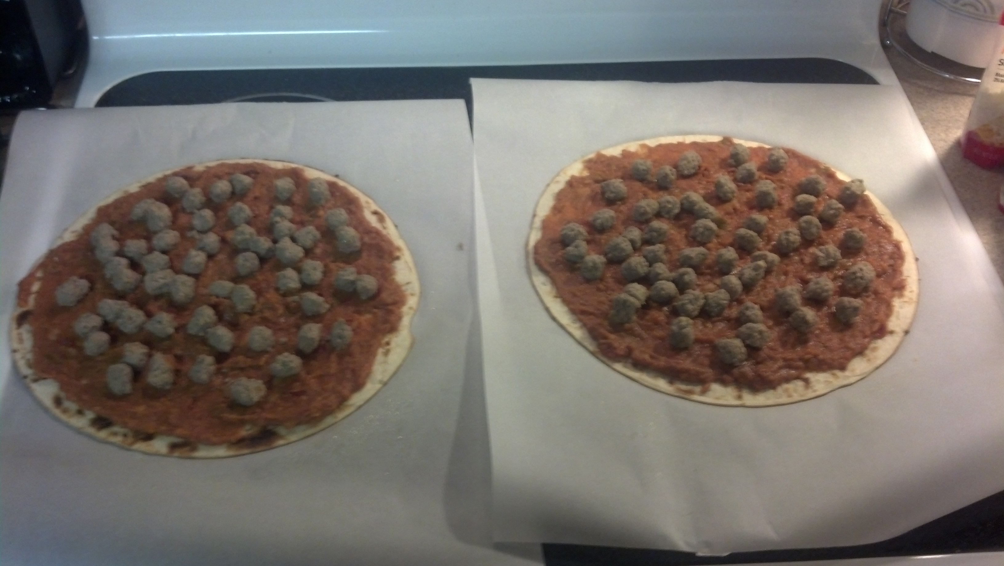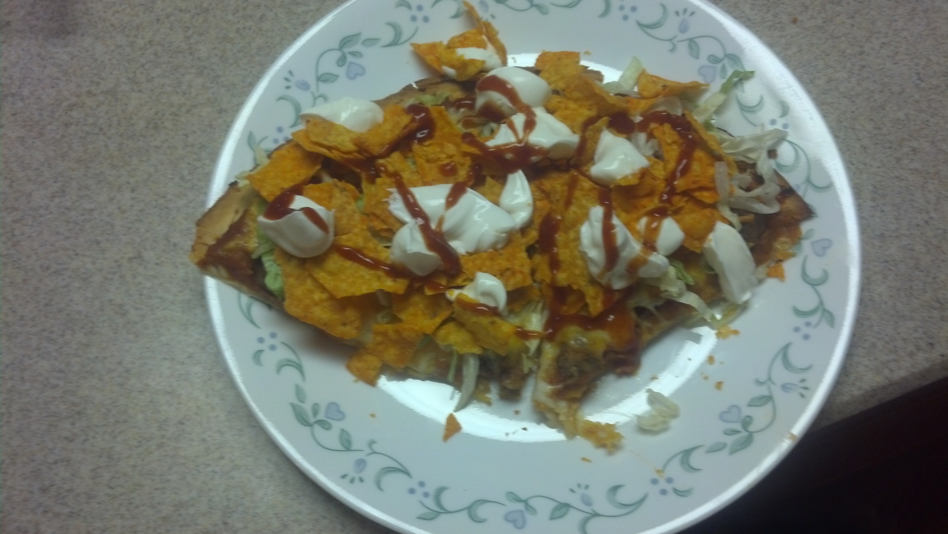 Last adjustment..I sliced it up first and added the lettuce and chips (Doritos) per slice...this way when I reheat it, I'm not reheating the cold toppings, so it should be just about as good as round one. Was all pretty good...