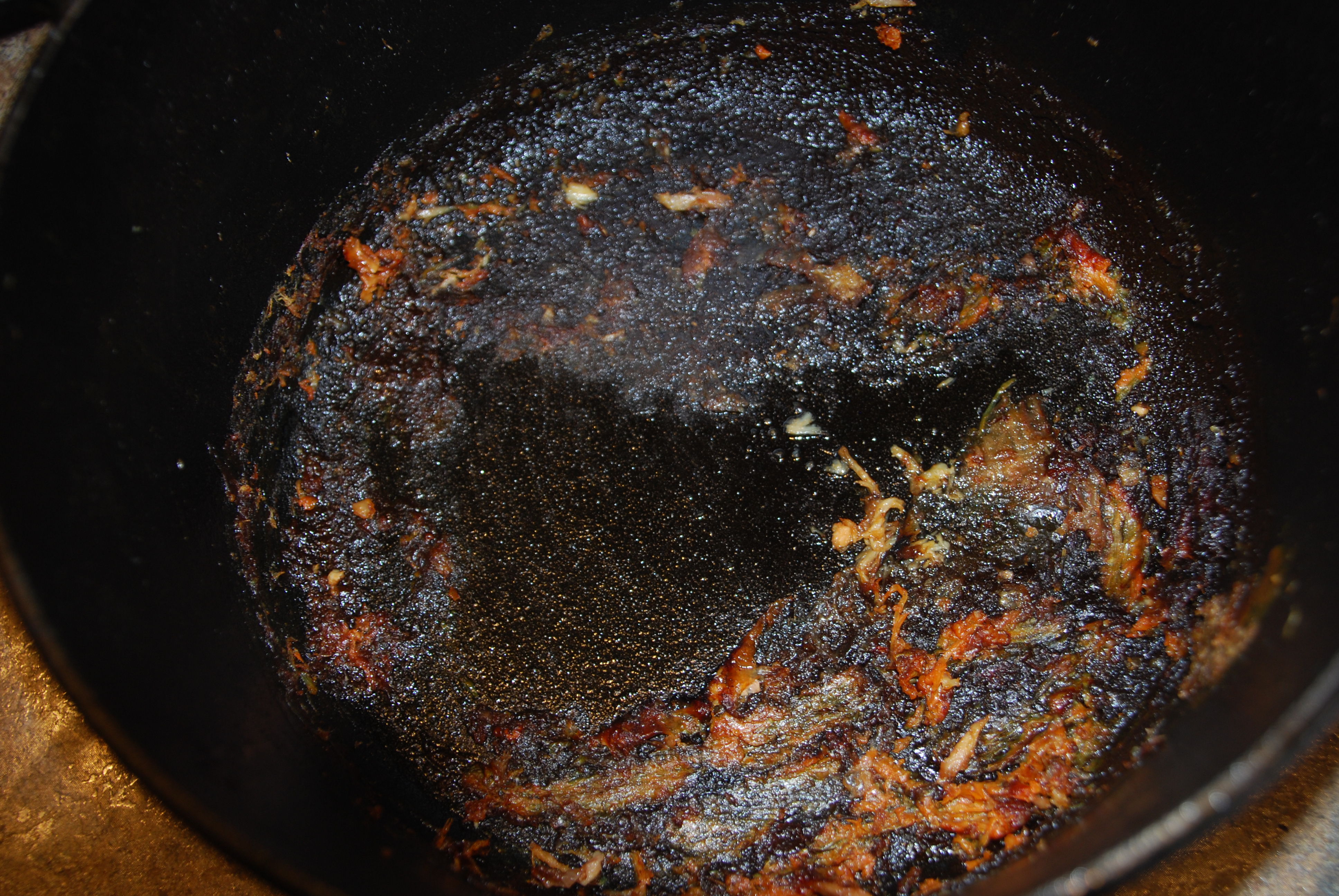Heated up the CI Dutch Oven, with a little EVOO and butter.  Chicken went in breast side down, along with some carrots and a few cloves of crushed, chopped garlic.