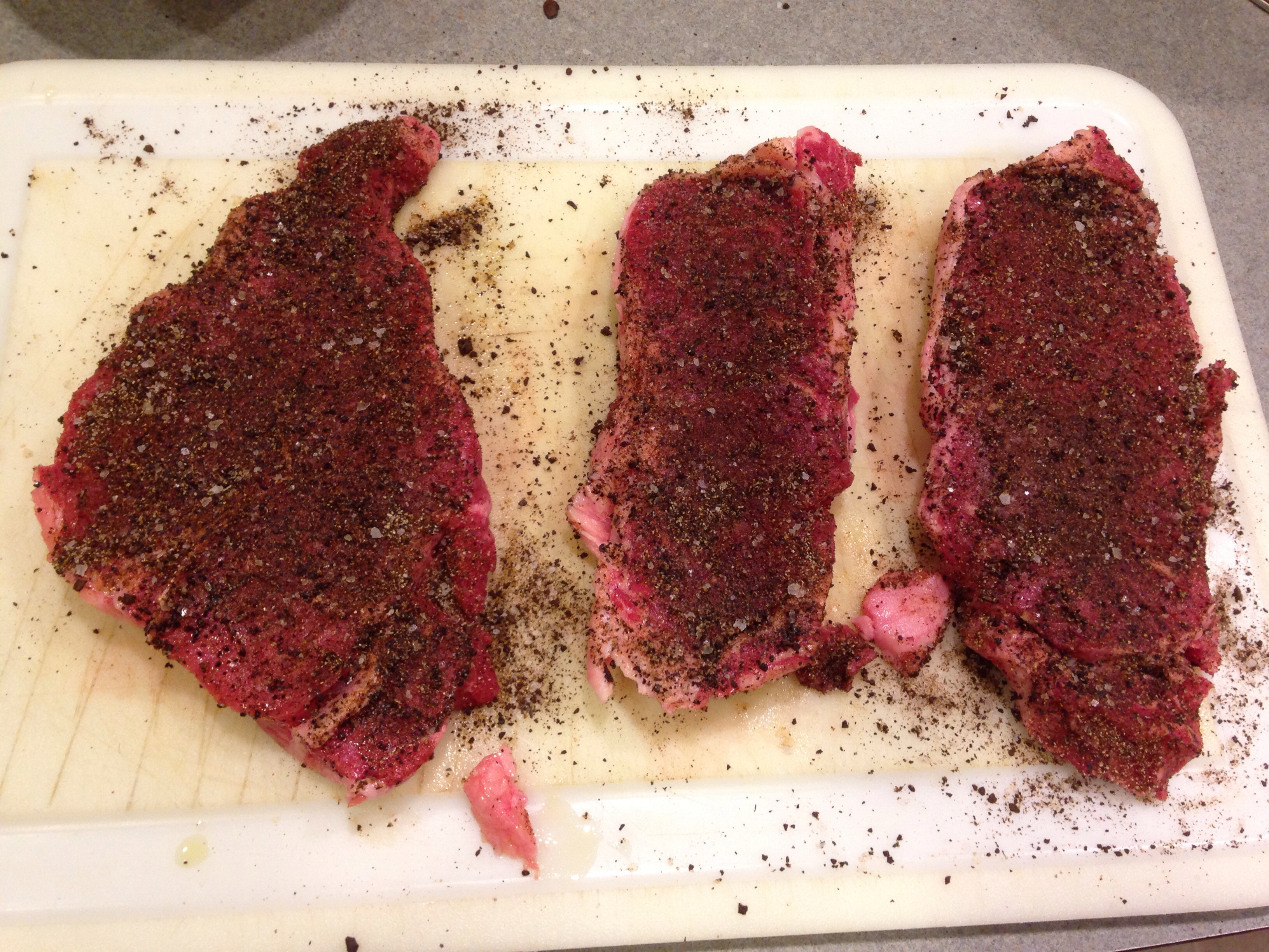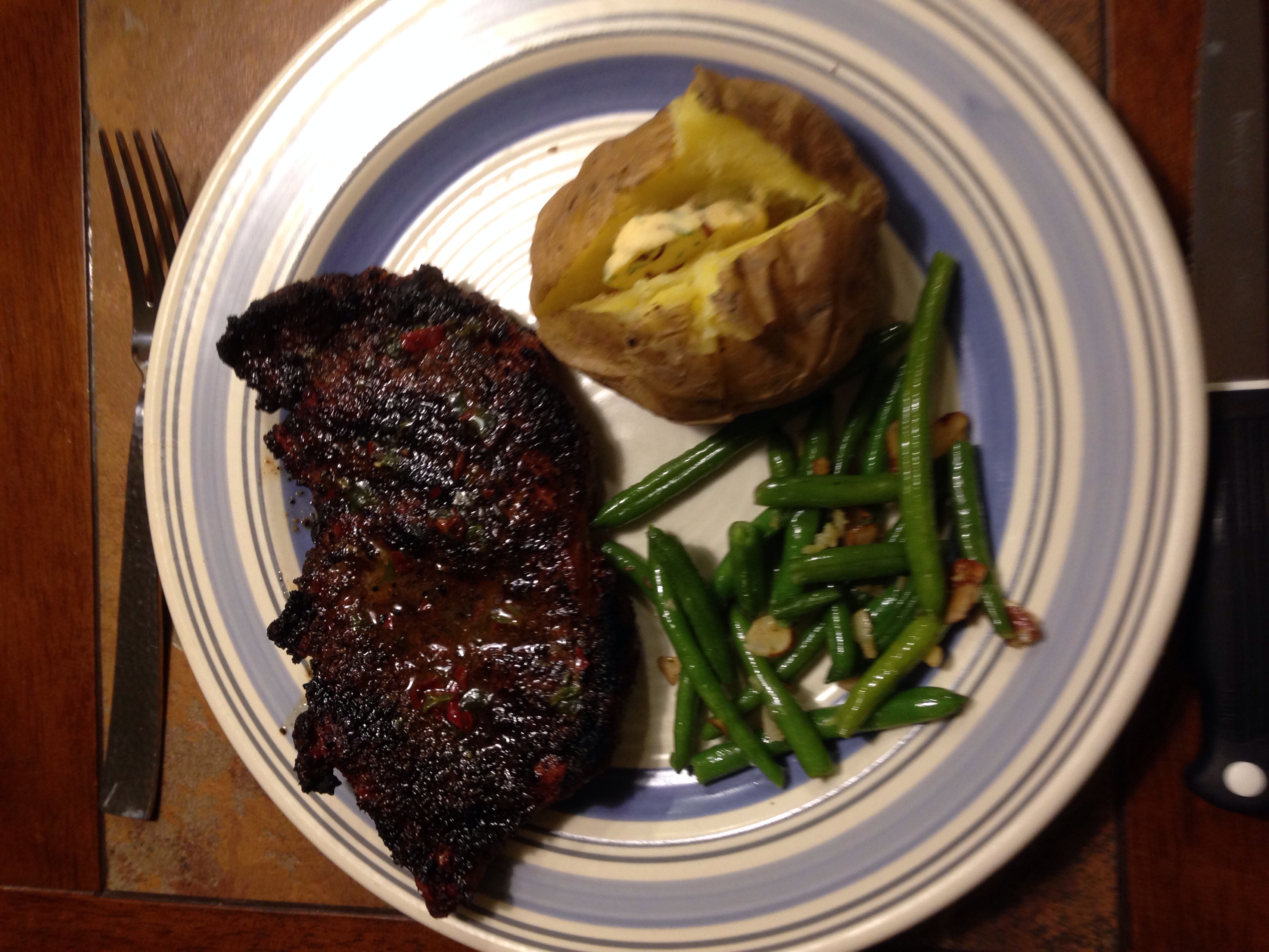 New York strips rubbed with EVOO and @Mickey's coffee rub. Served up with a baked potato and green beans sautéed in olive oil and slivered almonds. Good stuff.
