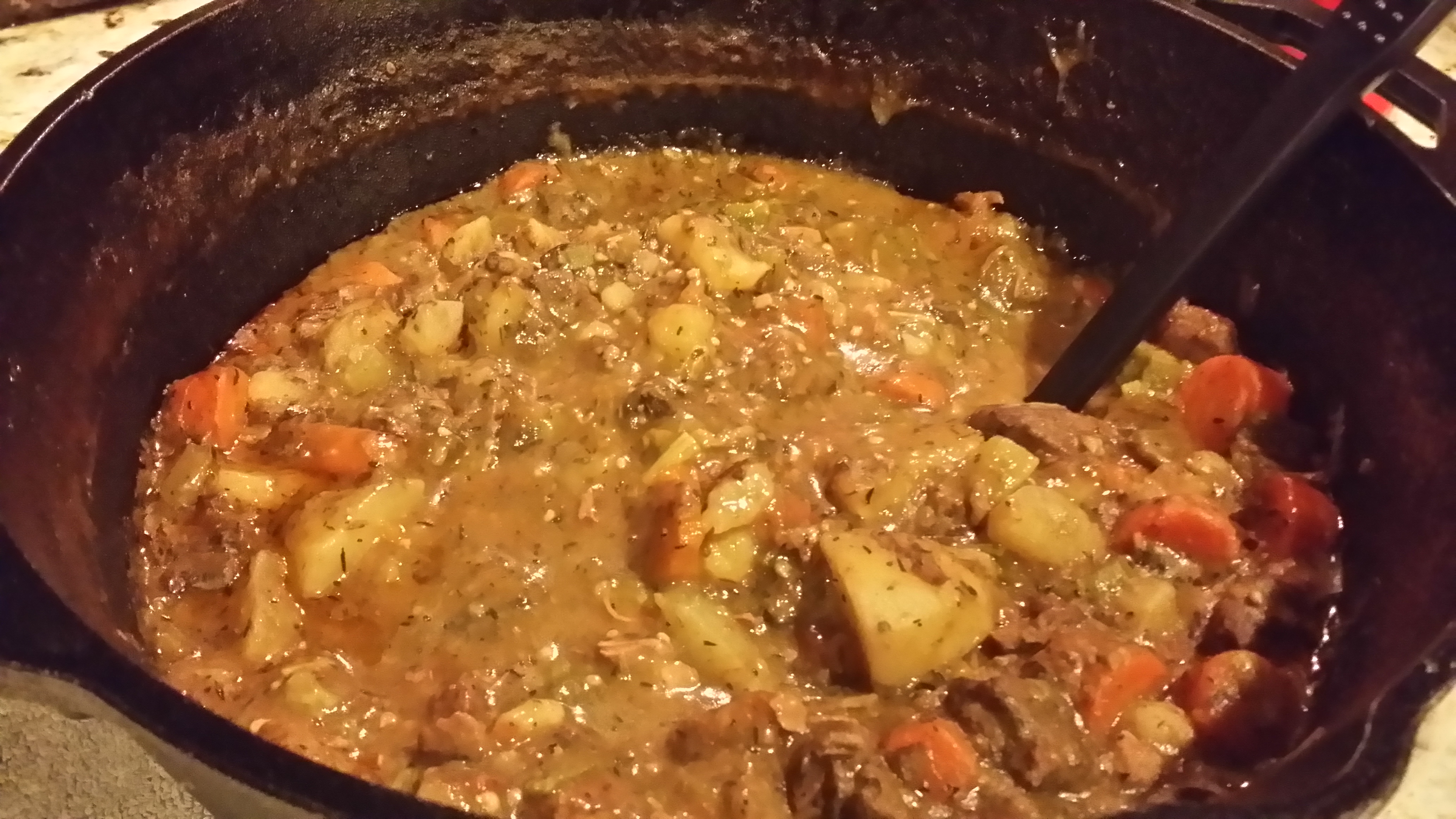 5. Cover and simmer for 30 to 45 minutes at 300 degrees. After that time, mix 2 tablespoons flour with a little water and pour into the stew and stir. Allow to cook and thicken for ten more minutes. Shut down BGE and allow stew to sit for 10 to 20 minutes before serving.