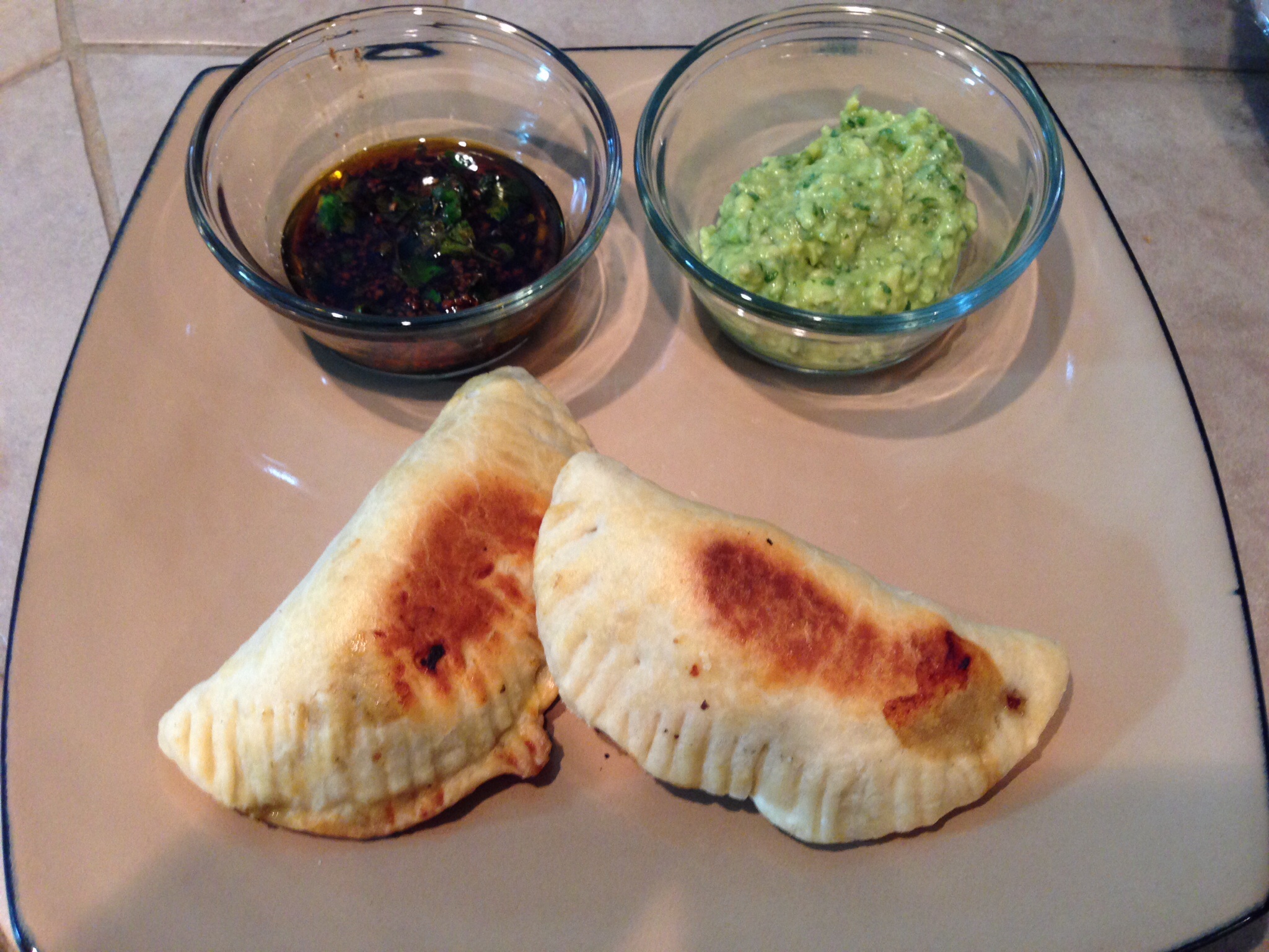 Cooked Empanadas Argentinas with two dipping sauces: Avocado Chimichurri and Balsamic Chimichurri. Both were good but preferred the balsamic.
