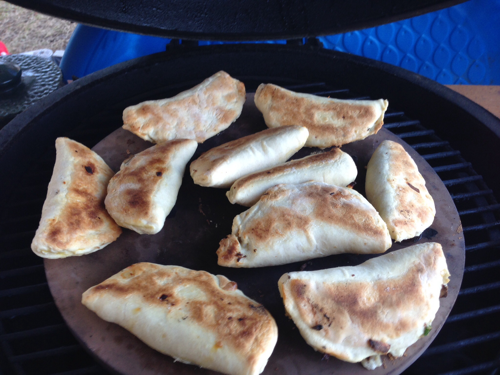 @drummerben - the Egg was still setup from the empanadas and was plate setter legs up, standard grate, pizza stone; temp was about 400 dome. They cooked really quickly, maybe 3 minutes.LBGE & SBGE. Central Texas.