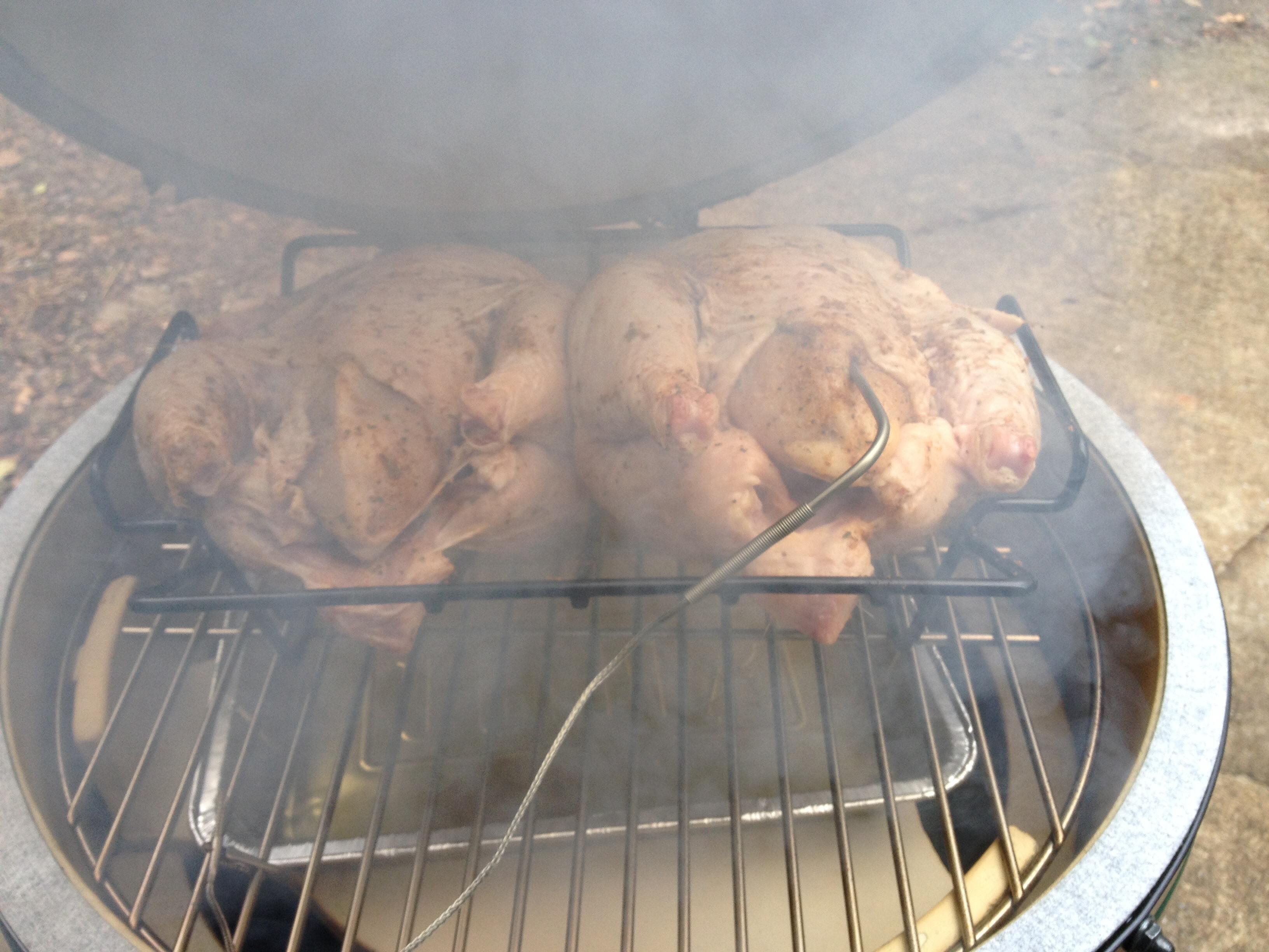 Two young Gamecocks with a little olive oil and chicken rub. Temp running between 259 - 275.
