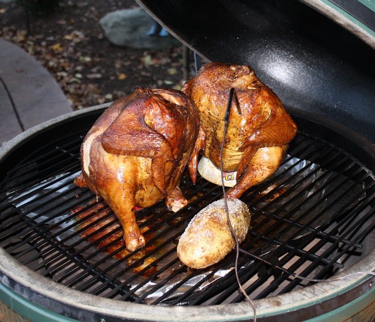 Now this one I have success with. I could to almost 180 and it is so good with the apple chips. I know most people say 160 but we do one all the time and it is moist. Kosher salt and water for hours before the rub. For Christmas I had prime rib in the oven and whole beer chixs on the egg. They all came out at the same time. I did pat myself on the back!