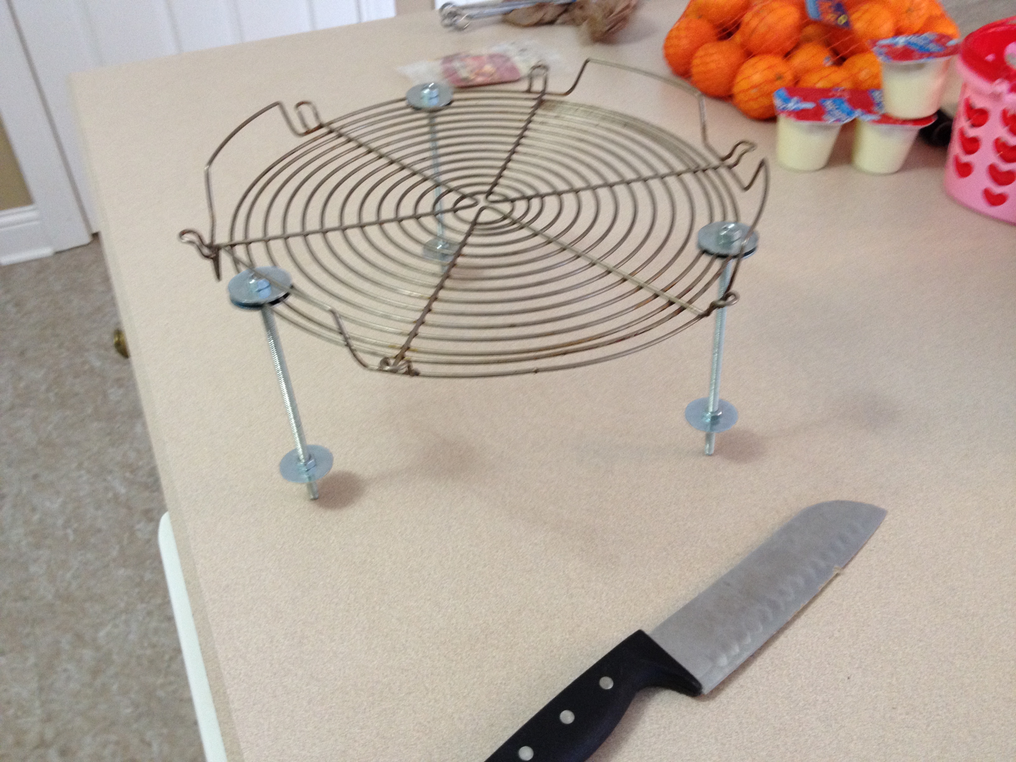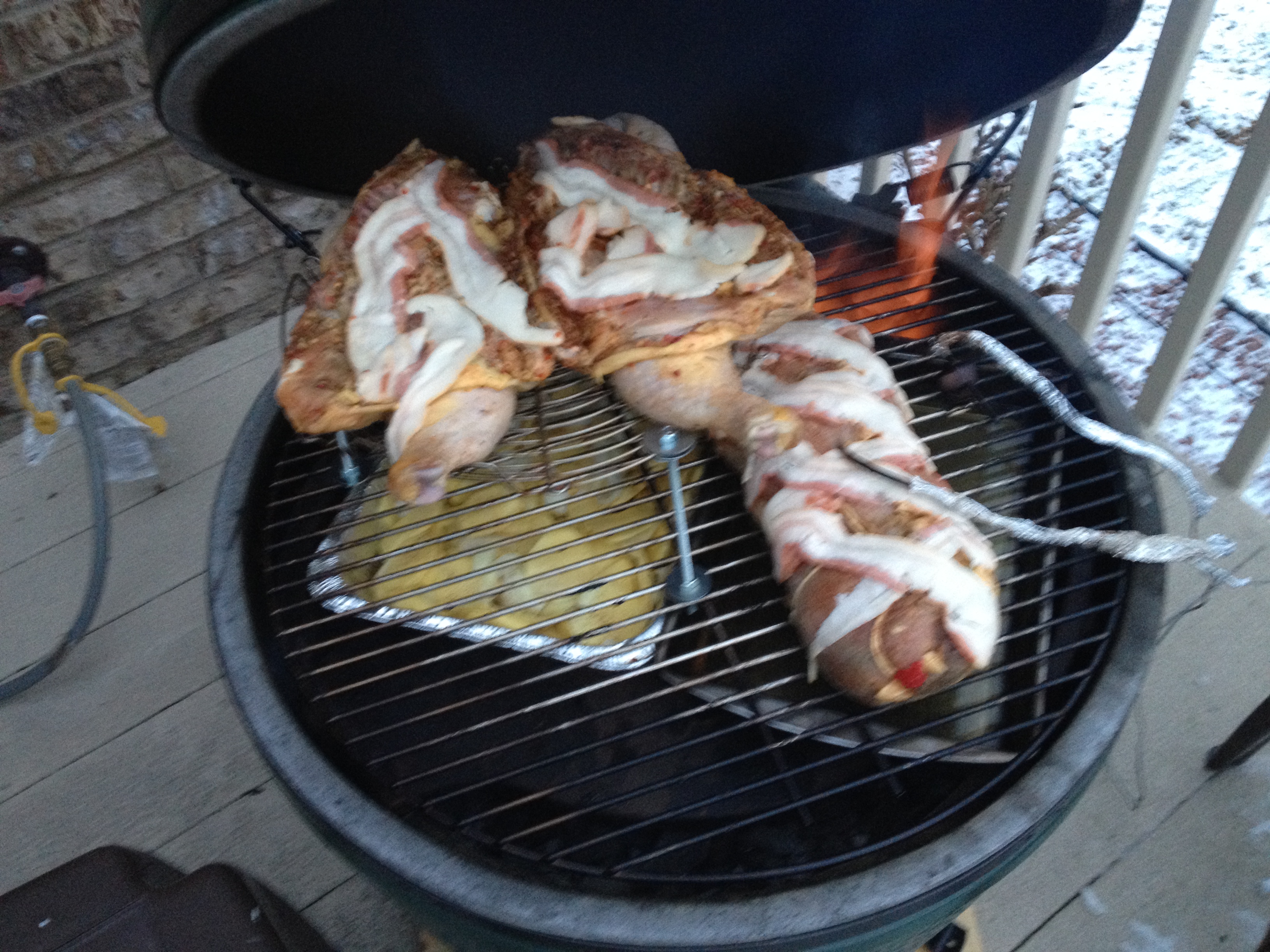 Got my homemade raised grid together and food in the Egg. And yes that is bacon on the spatchcock chicken !!!!!!!