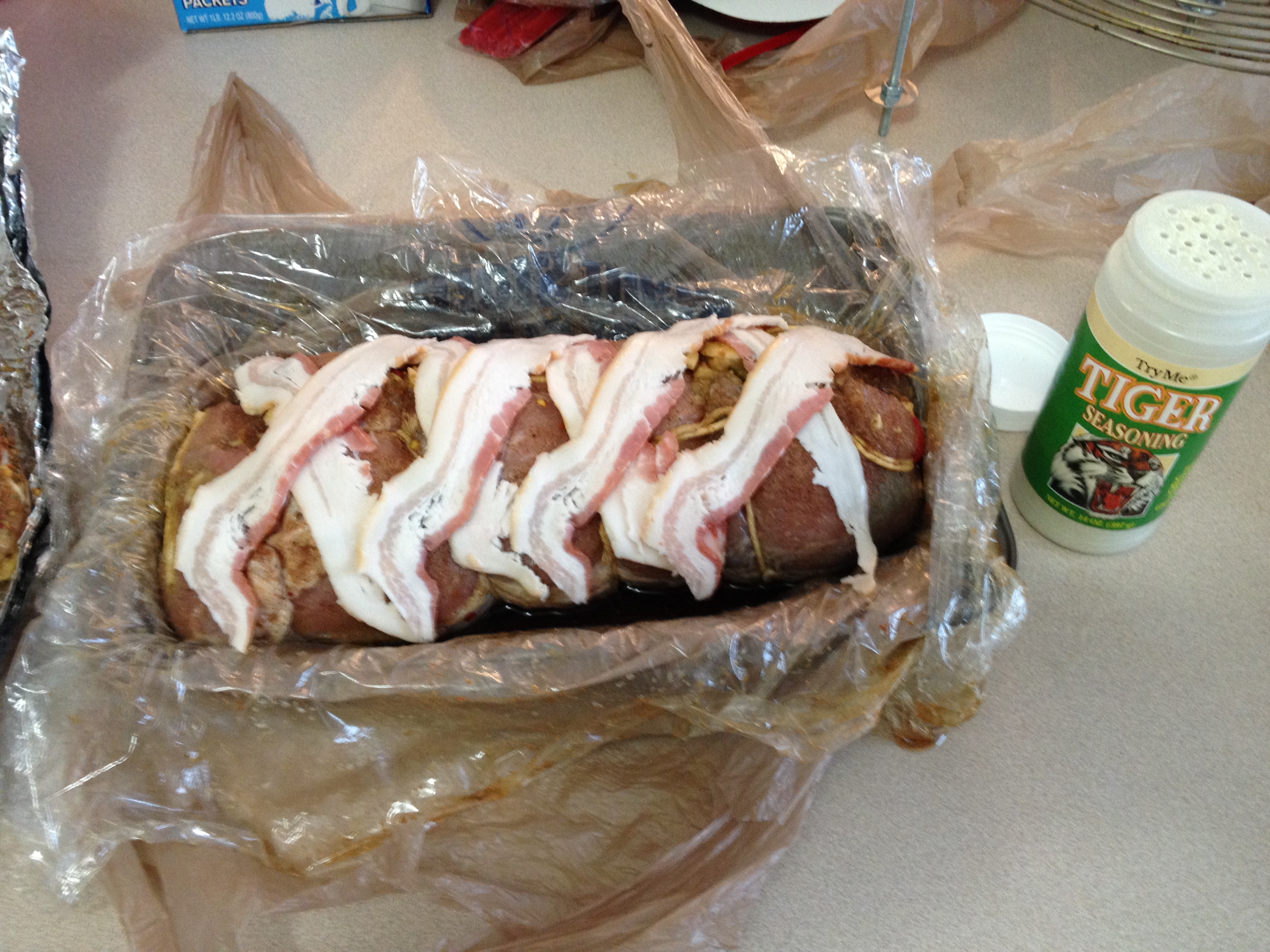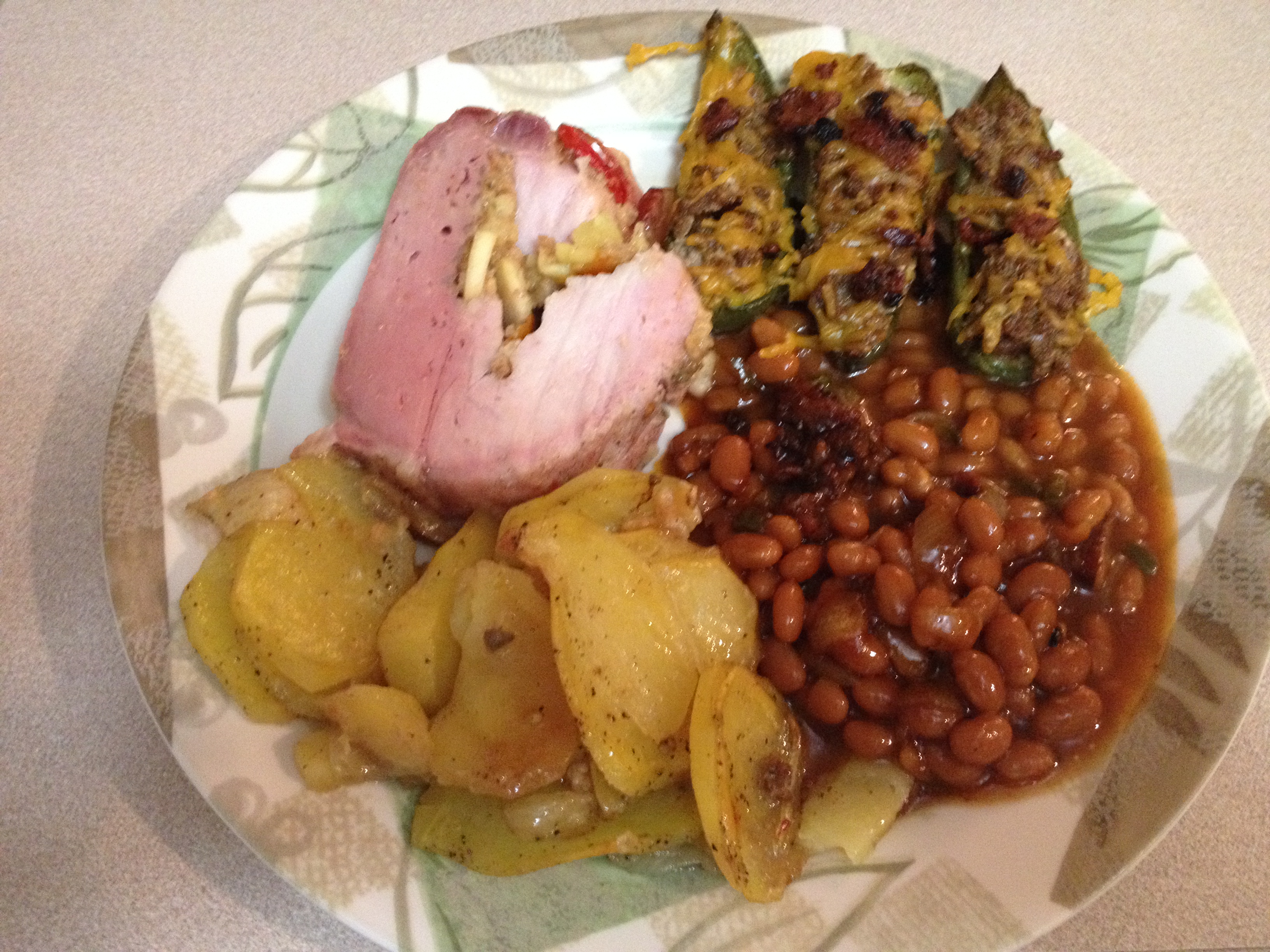Apple Dressing stuffed Pork TL, Yukon Potatoes, Spatchcock chicken, ATBs  , and smoky baked beans !!!!!!!!!!!!!!!!!