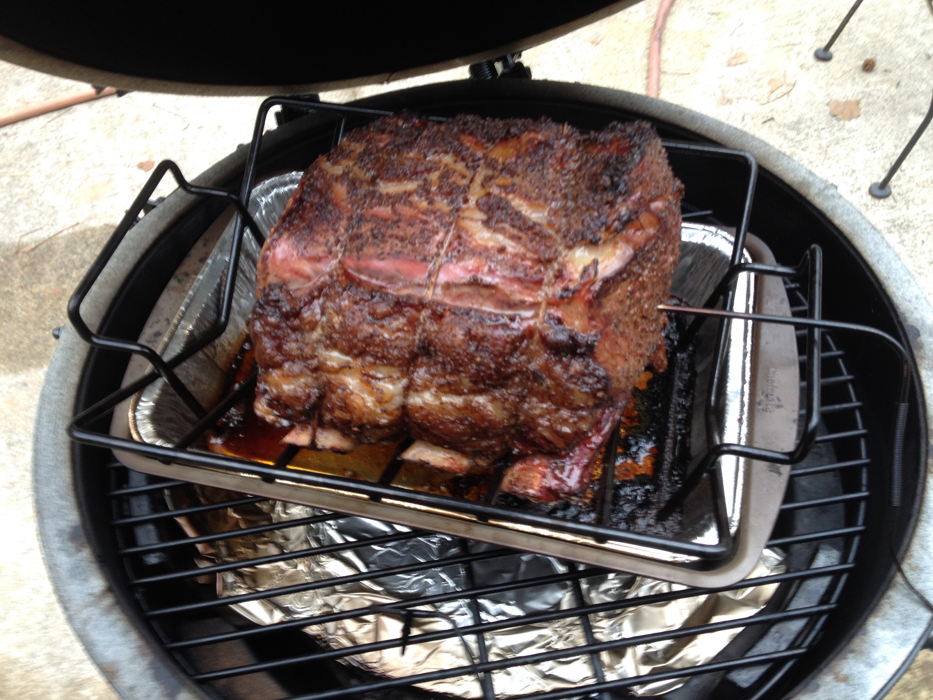 First attempt at cooking a rib roast in the Egg. 6.3 pounder that I rubbed with olive oil and sprinkled with Montreal Steak Seasoning and Lawry's Seasoned Salt. Kept the Egg around 325-350 the whole time and took the roast off when internal was about 122. Tented in foil for 30 minutes. Good stuff!