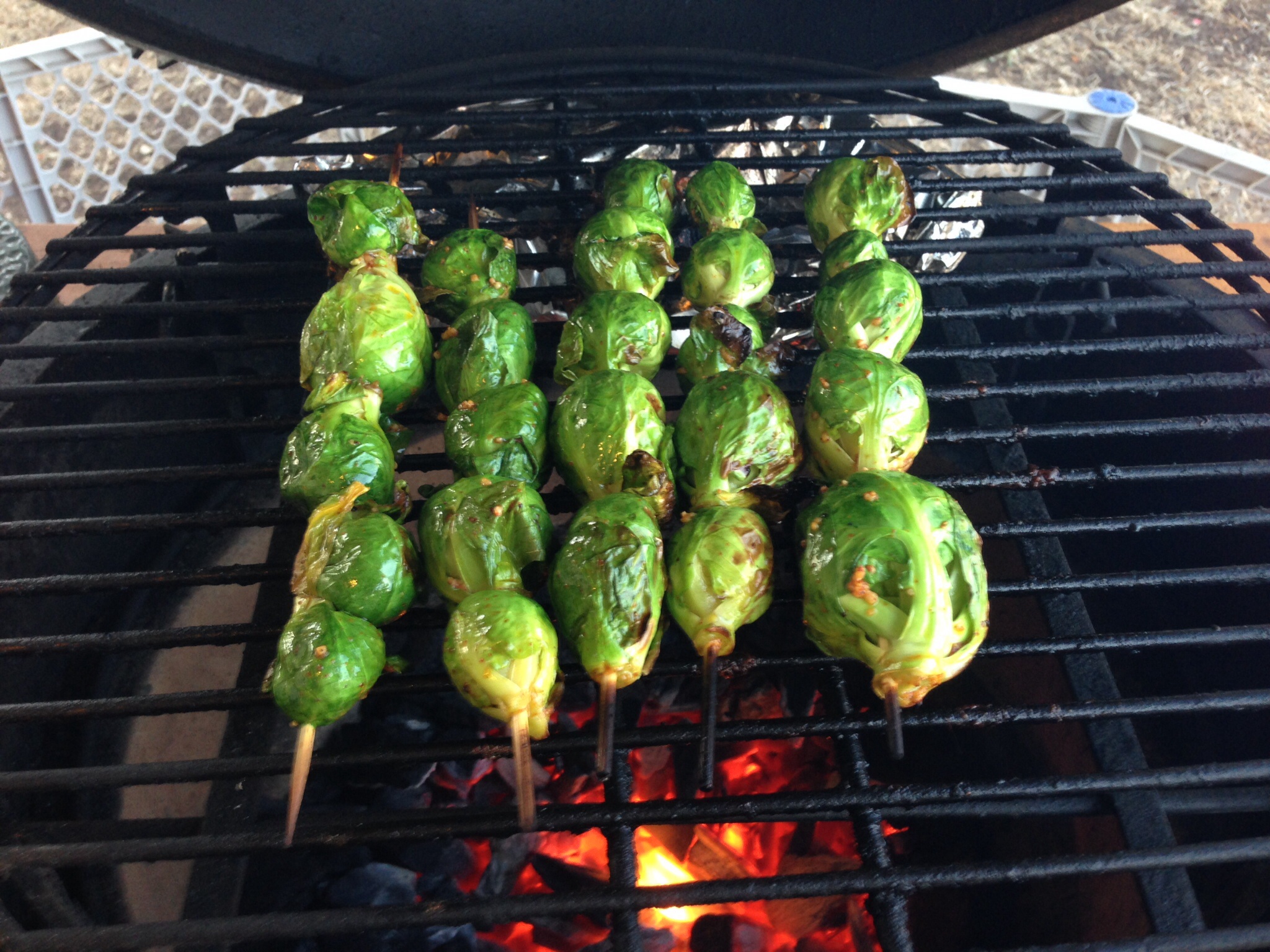 Pre-cooked the brussels sprouts 3 minutes in the microwave and then tossed with a mixture of 2 Tbs EVOO, 1 Tbs garlic, 1 tsp paprika, 1 tsp dry mustard, salt and pepper. Skewered and grilled raised direct over hit heat. Very tasty.