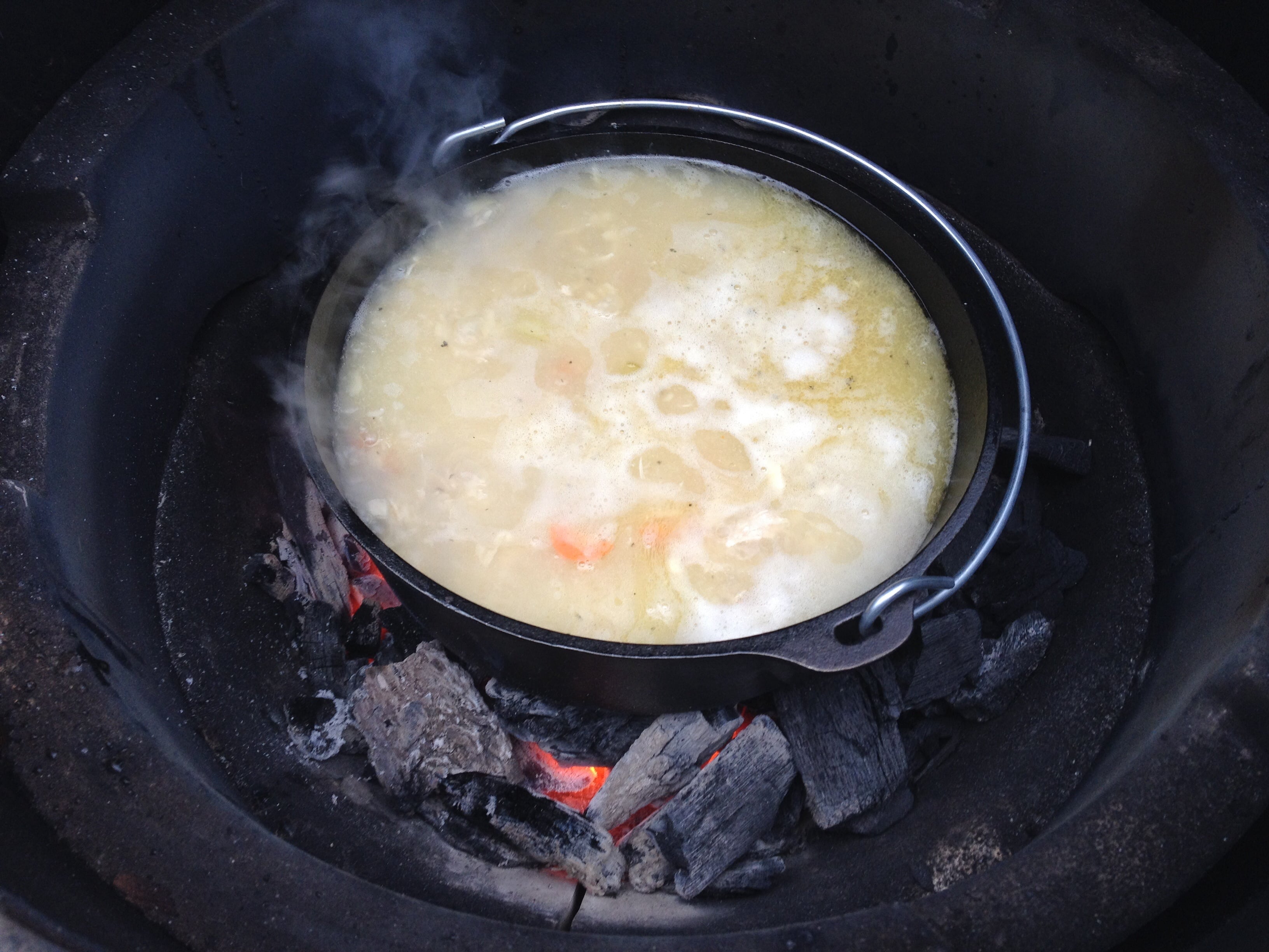 Wife made chicken noodle soup in the crockpot yesterday so I warmed it up in the BGE. Still no power, but at least we have full bellies. Burgers are on the menu for supper.