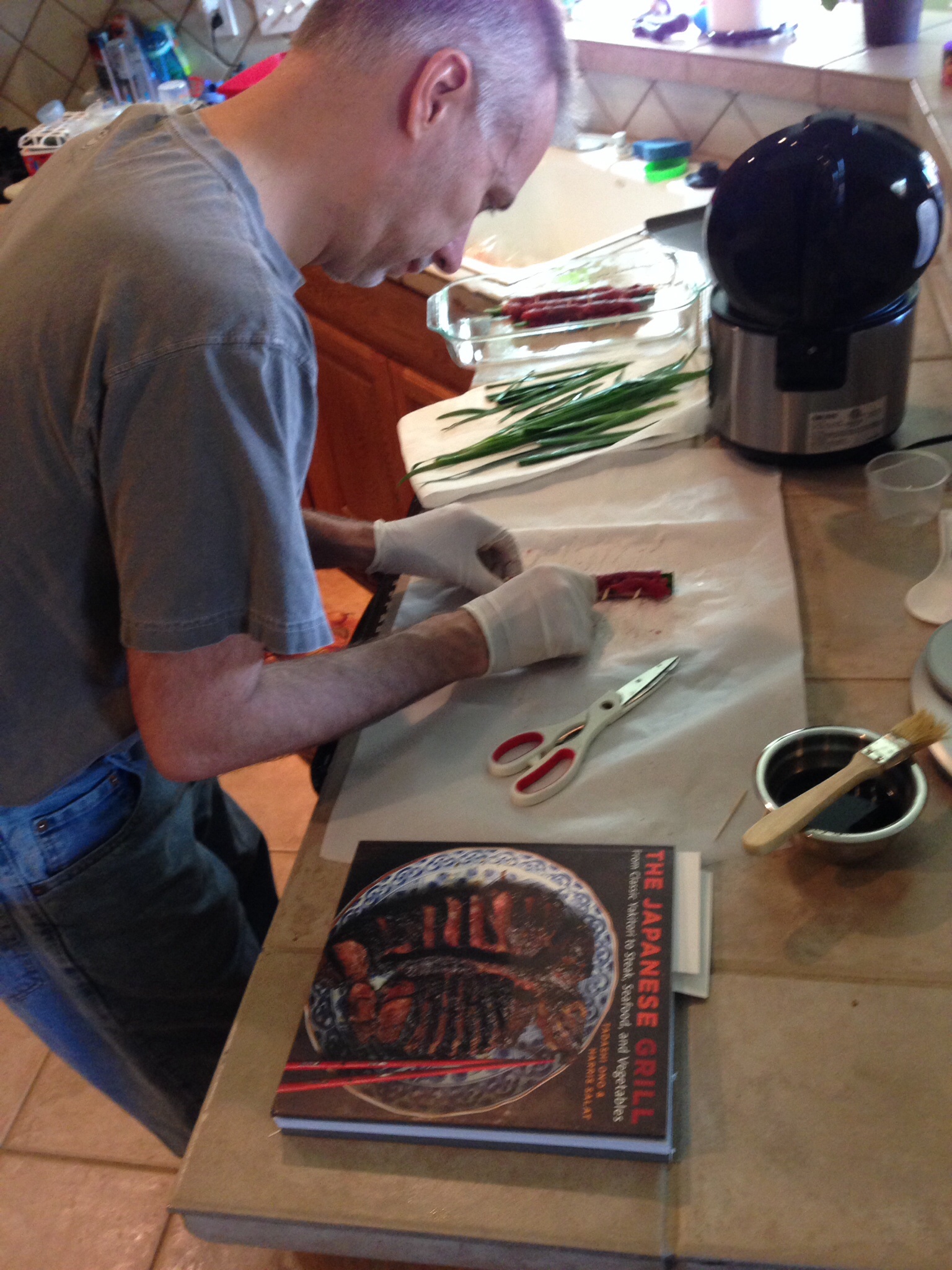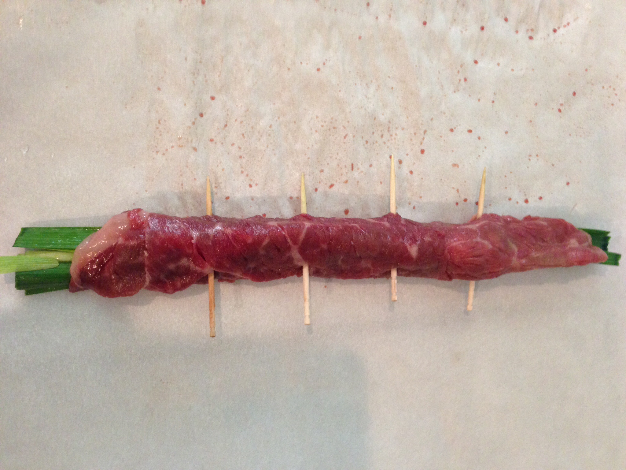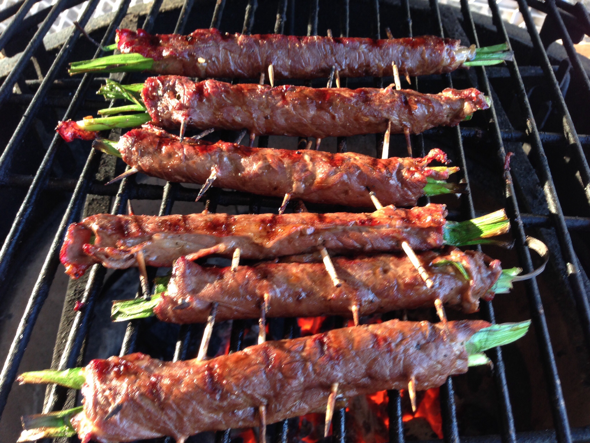Picked up thin sliced beef; at the Japanese market; expensive per ounce, but razor thin and good quality meat. Laid it out on wax paper, put scallions on top, rolled up and secured with toothpicks. Cooked raised direct over high heat turning every minute and basting with a mixture of mirin, soy and same. Total cook time was about six minutes.