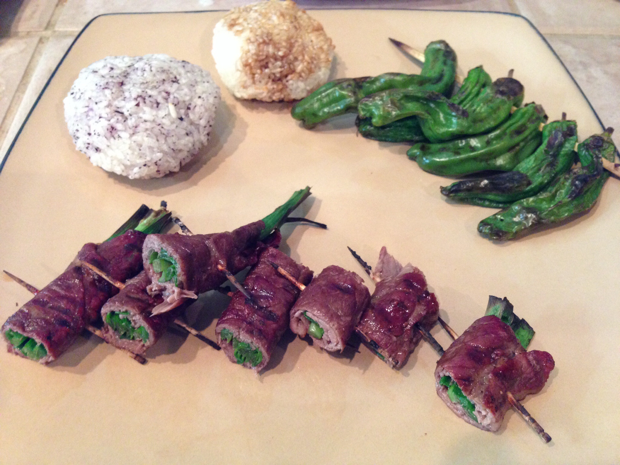 This was really good! Shishito Peppers, Japanese Rolled Scallion Beef, Yukari Shiso Yaki Onigiri