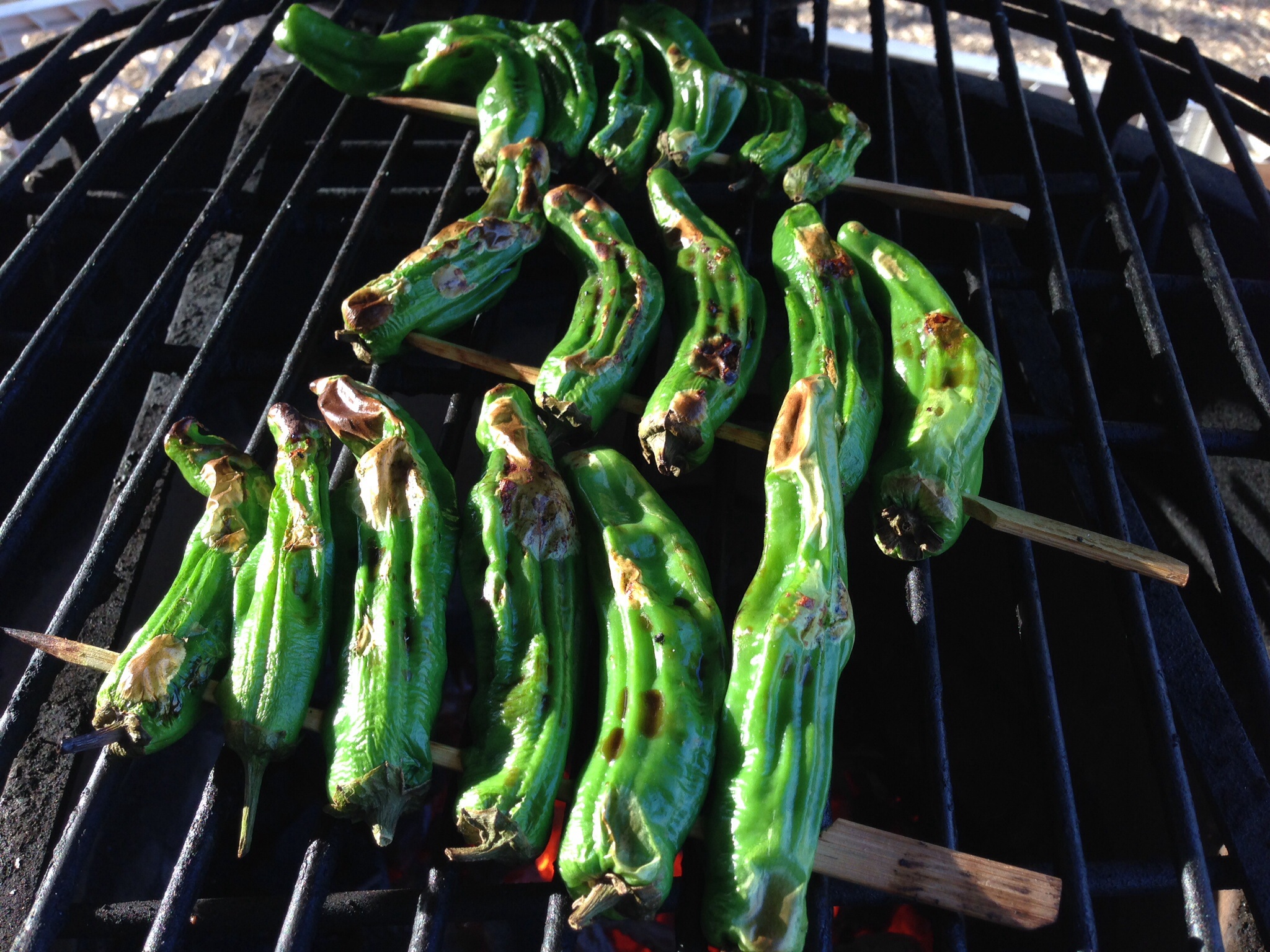 I had read about Shishito peppers but never tried them; they were great...sweet, rich flavor, just a tiny bit of heat. Skewered and brushed with a soy sauce and sake mixture, cooked about 4-5 minutes raised direct until the peppers started to blister.