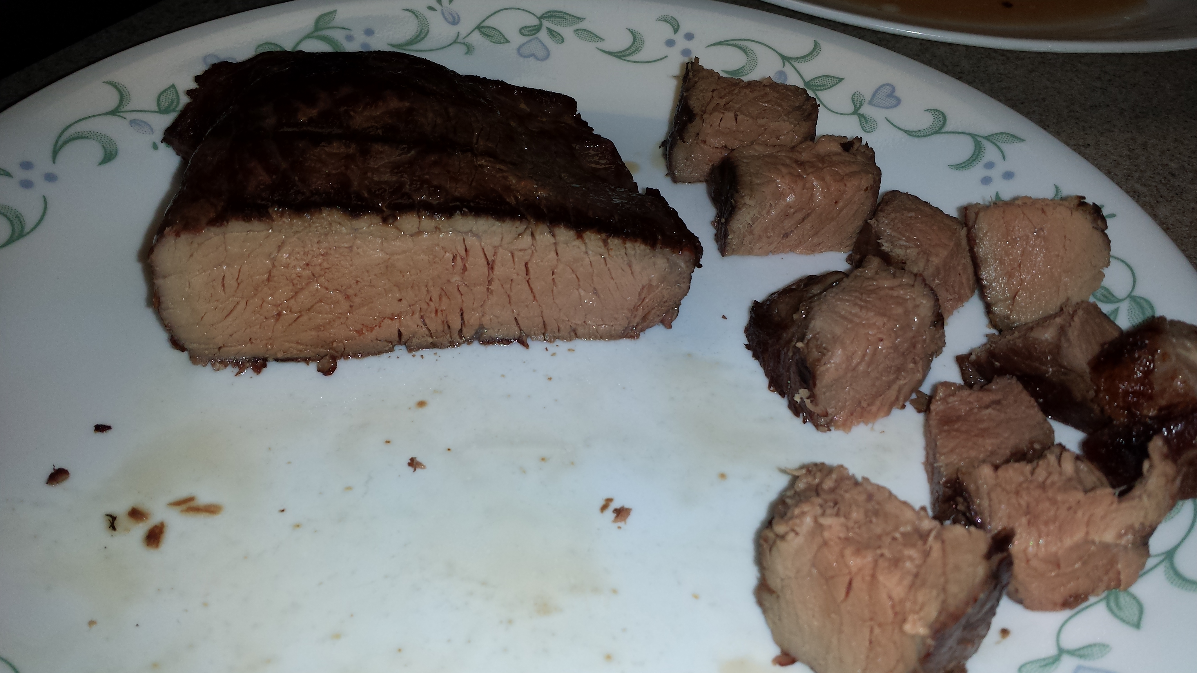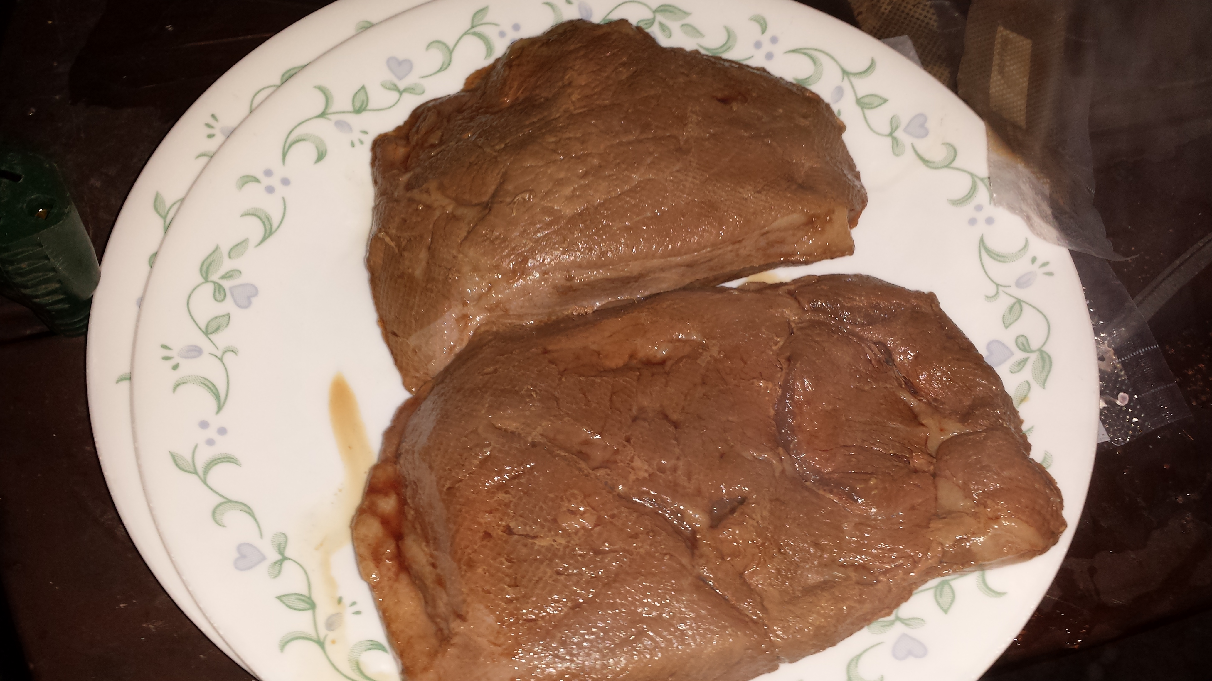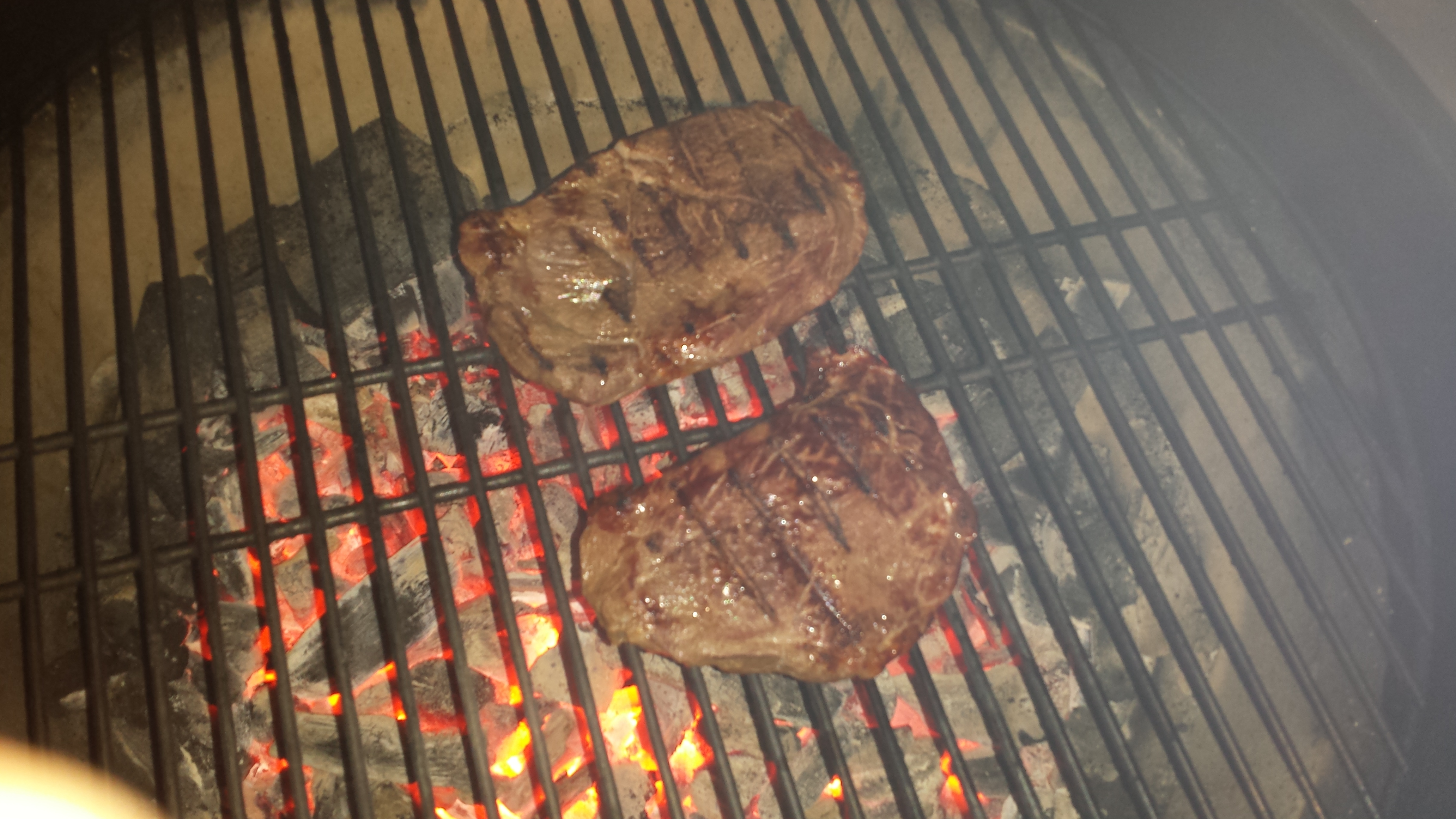 Decided I couldn't go wrong with a few steaks...2 ribeyes and a sirloin tip (kids love these). Dusted mine with @mickeys coffee rub and sealed em up. Dunked for about 4 hours at 135...then finished on the XL at about 650 dome temp for 60 seconds per side...rested for about 10 minutes then had the most tender steak ever...