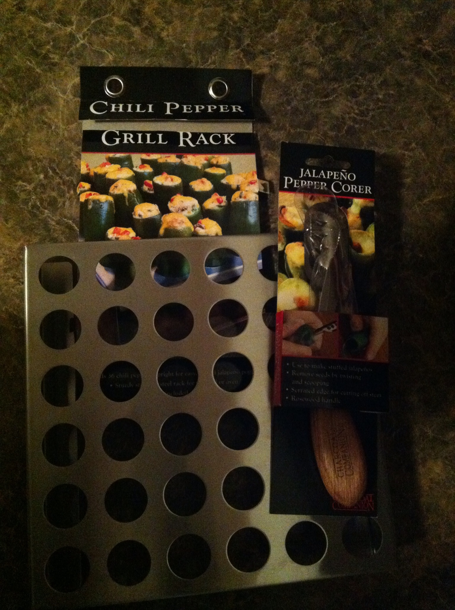 I scored a stuffed pepper rack today for 50% off. It ended up being $14.99. The deal got even better when I opened the box and found it came with a jalepeno seeder/corer. Love a good excuse to cook on the egg. Jalepeno's are in the fridge.