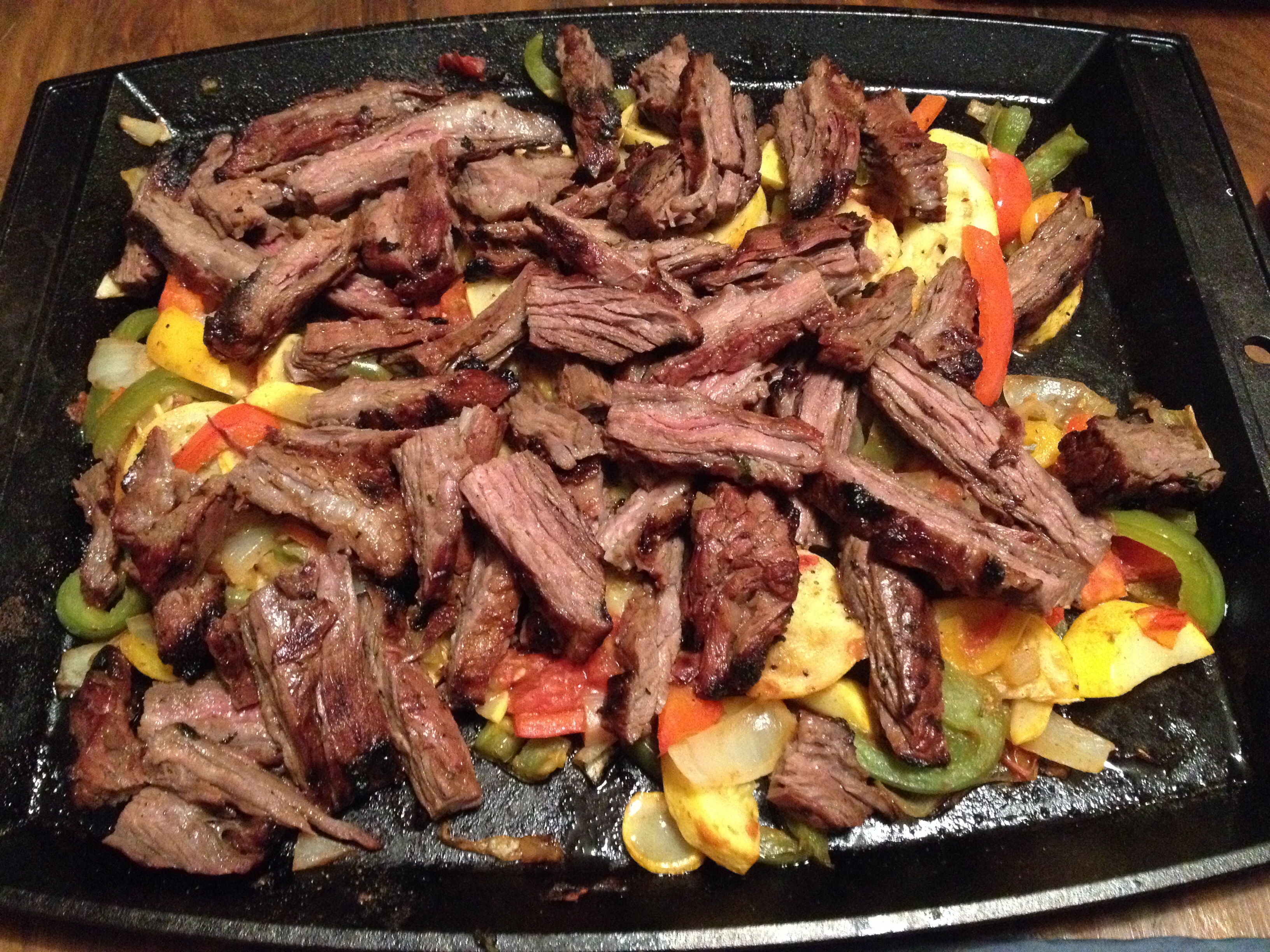 Skirt steak with onions, peppers, tomatoes and squash. Sautéed vegetables in cast iron pan and cooked steak direct on the grid.