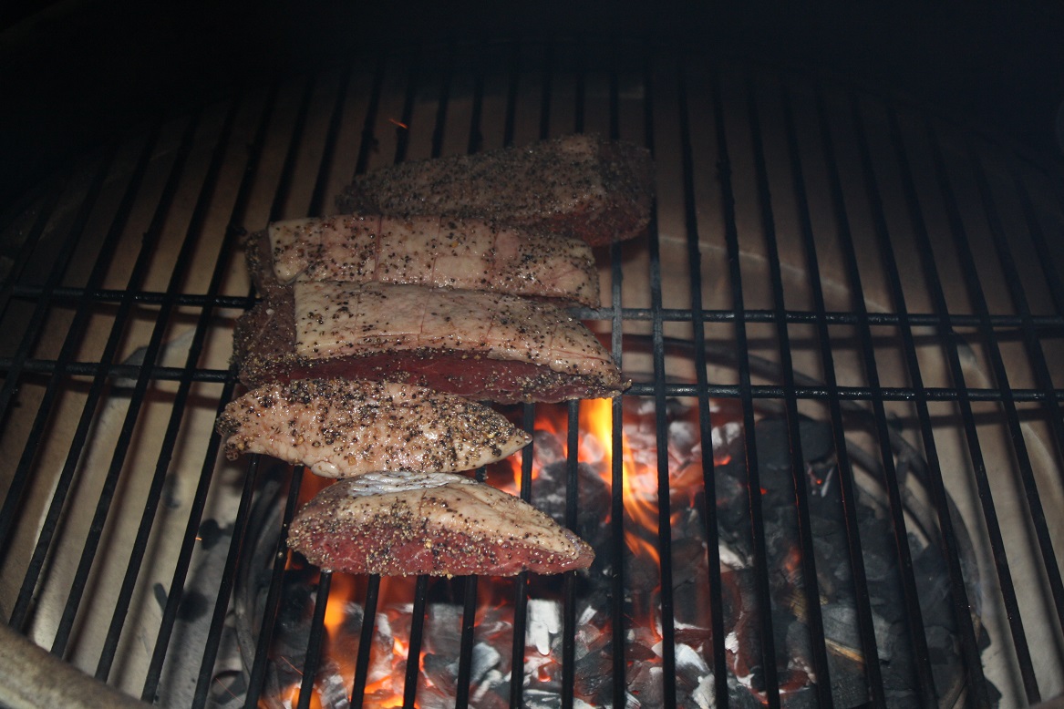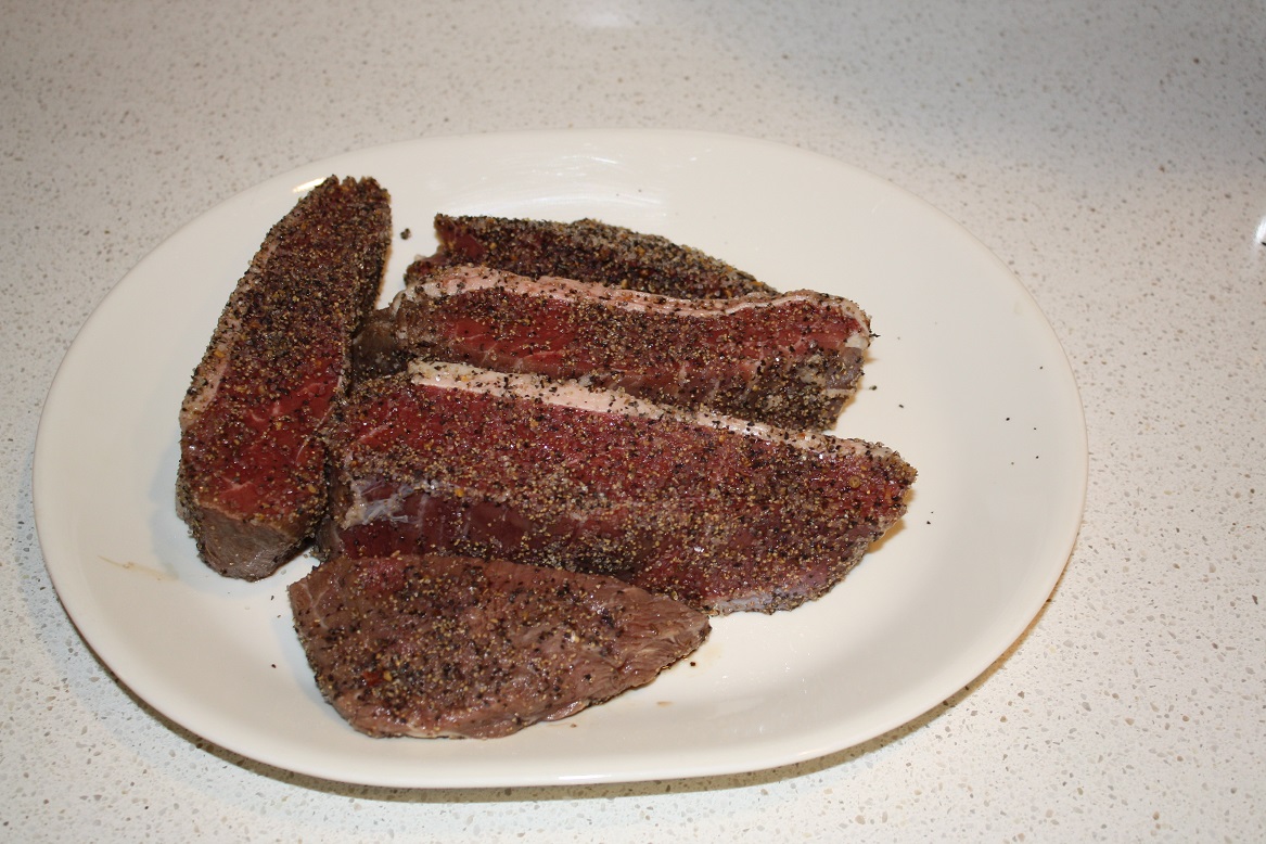 I could not find any food grade rock salt, so decided to use Montreal seasoning. I coated the steaks pretty good, then scraped most of the seasoning off after about 5 minutes, and before grilling. I grilled them direct on all 4 sides for about 10 minutes total, IT was 125 when I pulled them. Served with a salad and a side of rice with Caribbean black beans.