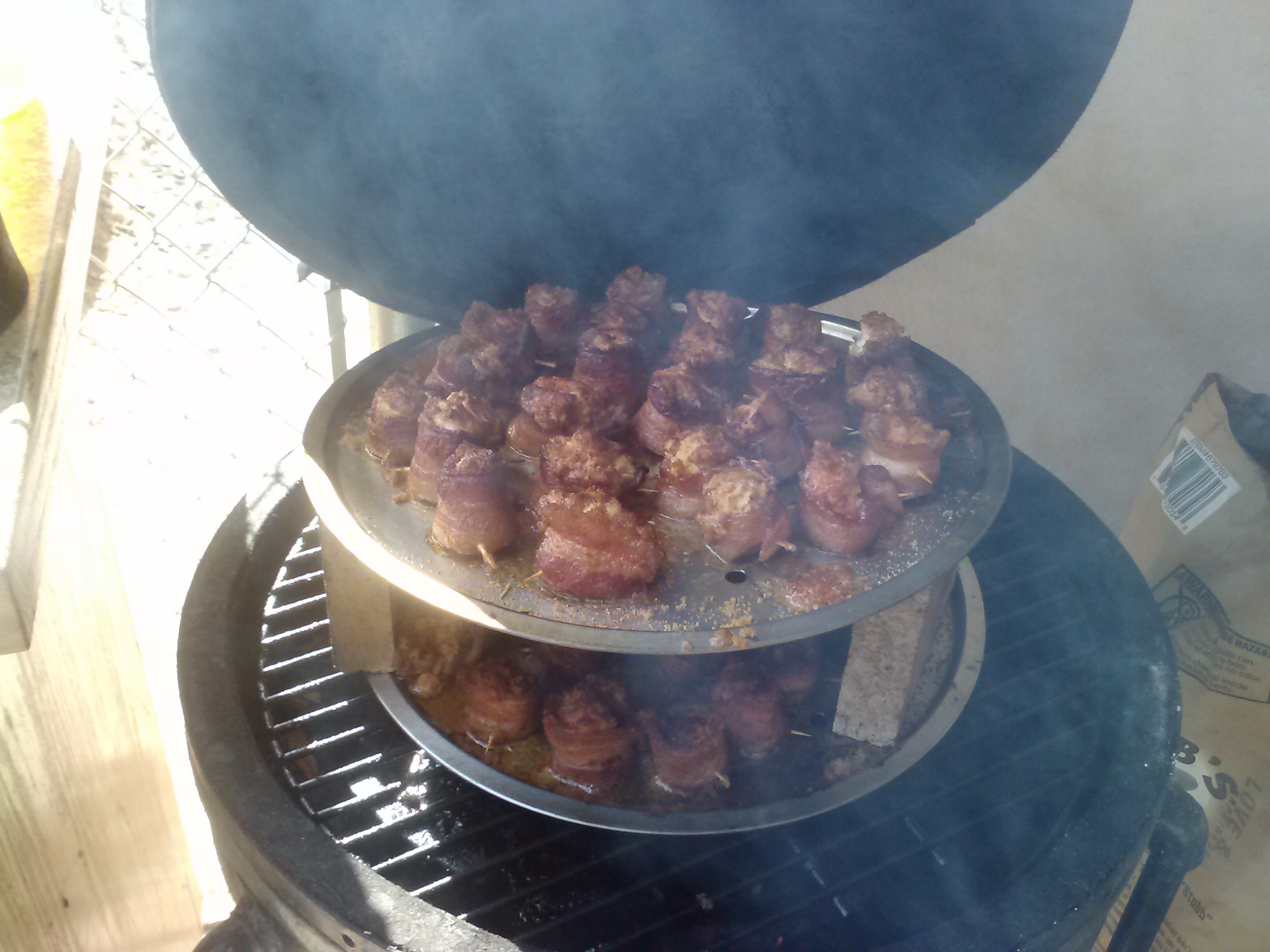 ! batch with Chipotle Cream Cheese mixed with Bacon ( because nothing goes better with Bacon than Bacon) and rub, the other batch regular cream cheese and bacon- Filled and topped with Brown Sugar- Instead of a piping bag, I bought some squeeze bottles from the Dollar Store, cut the tips bigger and put the filling in the bottles- made filling a breeze- You can see my custom extender as well