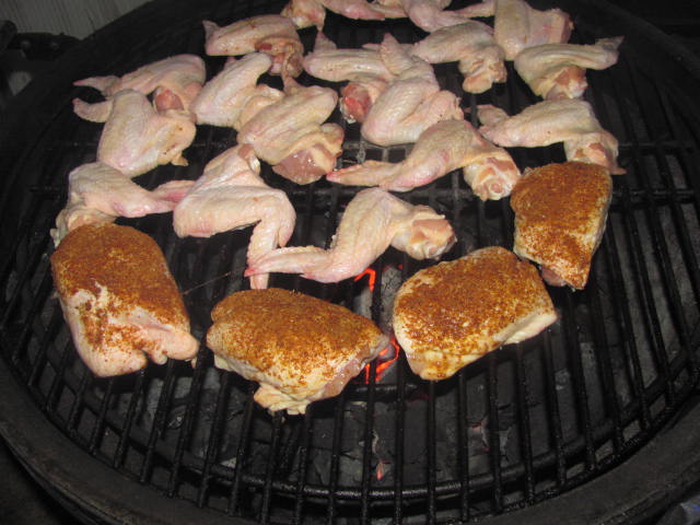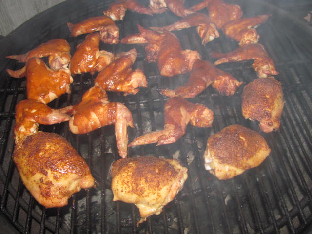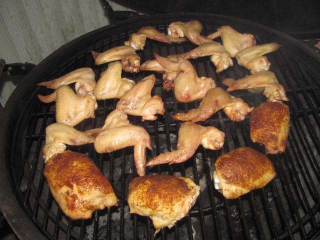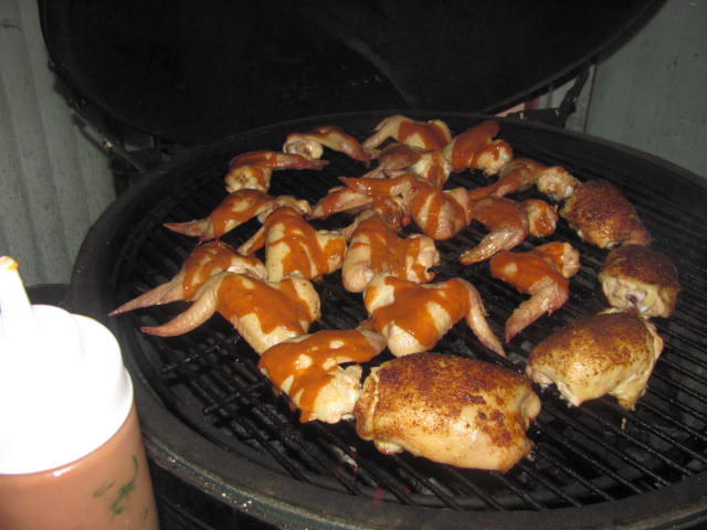 Cooked them naked direct, a bit cooler than usual (350) and at 20 minutes coated them. Coated again at 35 minutes and pulled at 45 minutes.