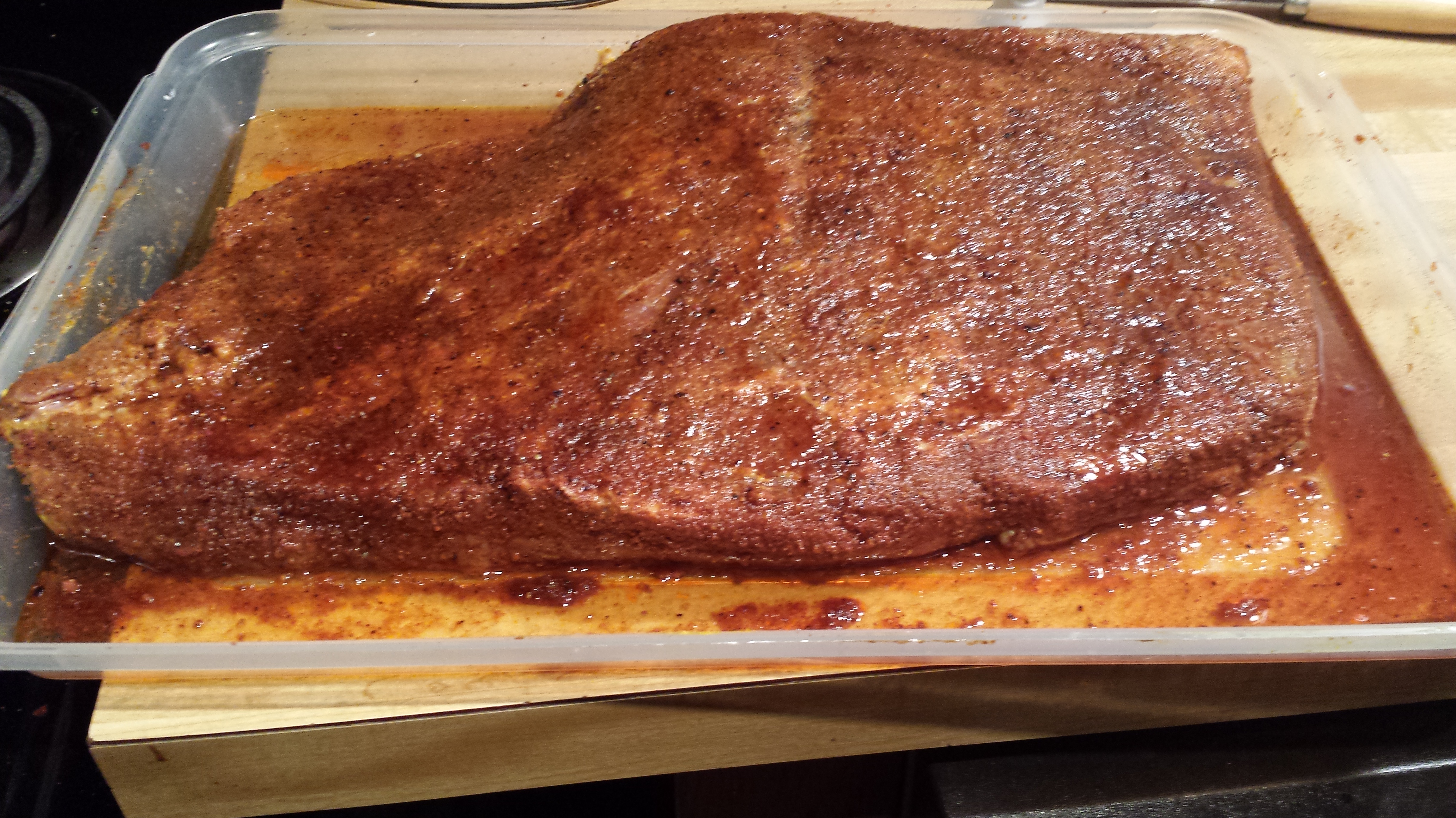 I bought a Certified Angus Beef flat last weekend from the local meat market. I usually get a whole packers but they are choice. As much as I wanted to do a packer I decided to go with the flat and see if the grade of beef makes a difference. I rubbed it down last night with some mustard, cow Lick and a couple other "try-out" ingredients. I set my alarm for 430 to get the egg fired up. The egg has settled in at 225 and the brisket is on. Nothing better than waking up at the ass cracked of dawn on a 10* morning to bbq!