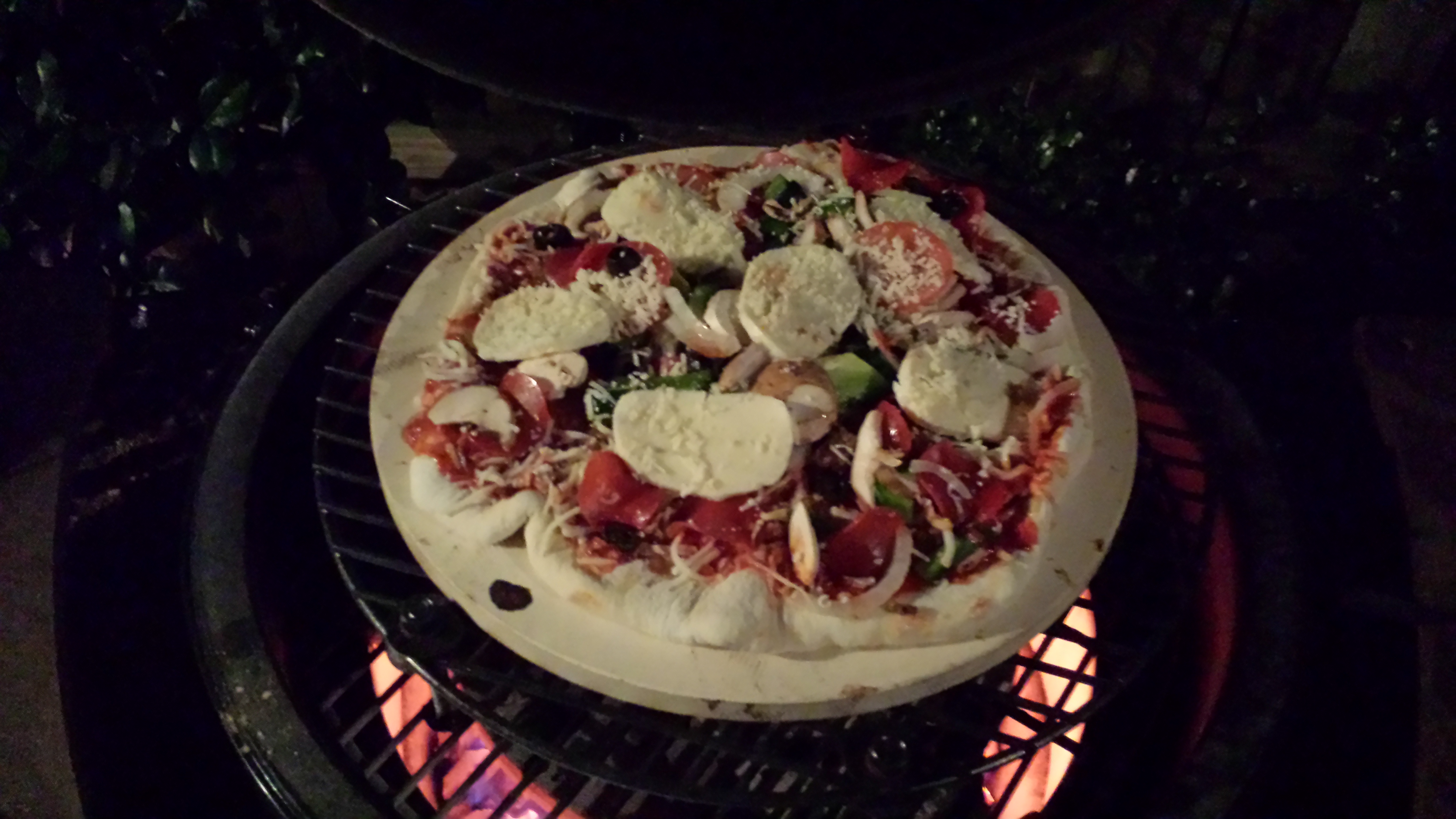 Had my first shot at some pizza on the egg this weekend turn out delicious. Did 3 pizzas at around 550°f platesetter in legs up grate on top with another grate raised about 3" with carriage bolts and a BGE stone. The dough was fresh Publix bakery dough let it sit on the counter for about an hour after getting it home. sauce was a Paula Dean recipe. Each one I let cook for about 10 min toppings were cooked well and the crust had a good crisp bottom. I think I have my go to method down even loved the store bought dough.