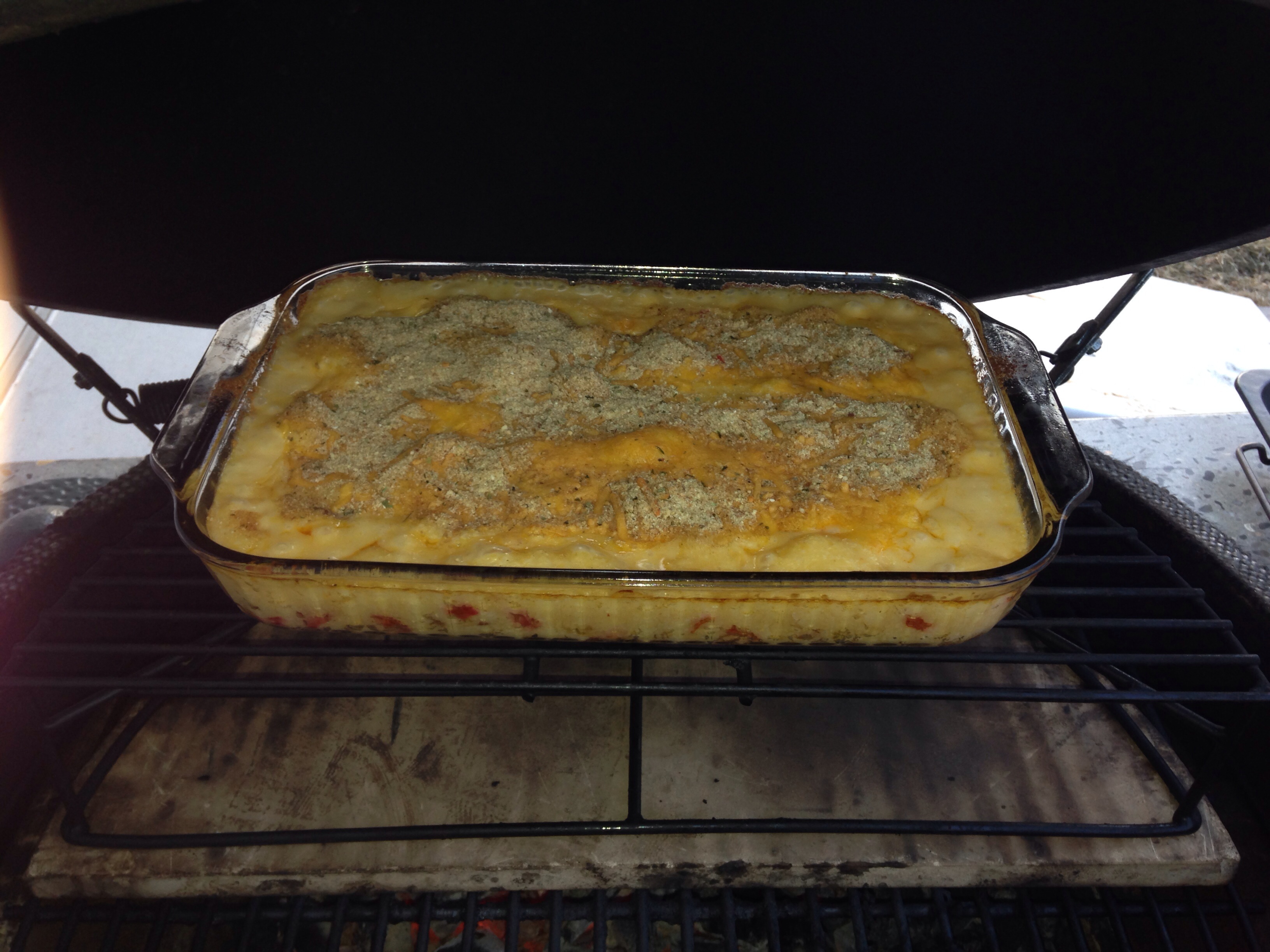 I got the idea from the BGE cookbook but didn't have the fancy ingredients it calls for. No heavy cream or stone ground grits. These babies were quick grits. It didn't call for peppers and onions, but they just go with sausages.Mark Annville, PA