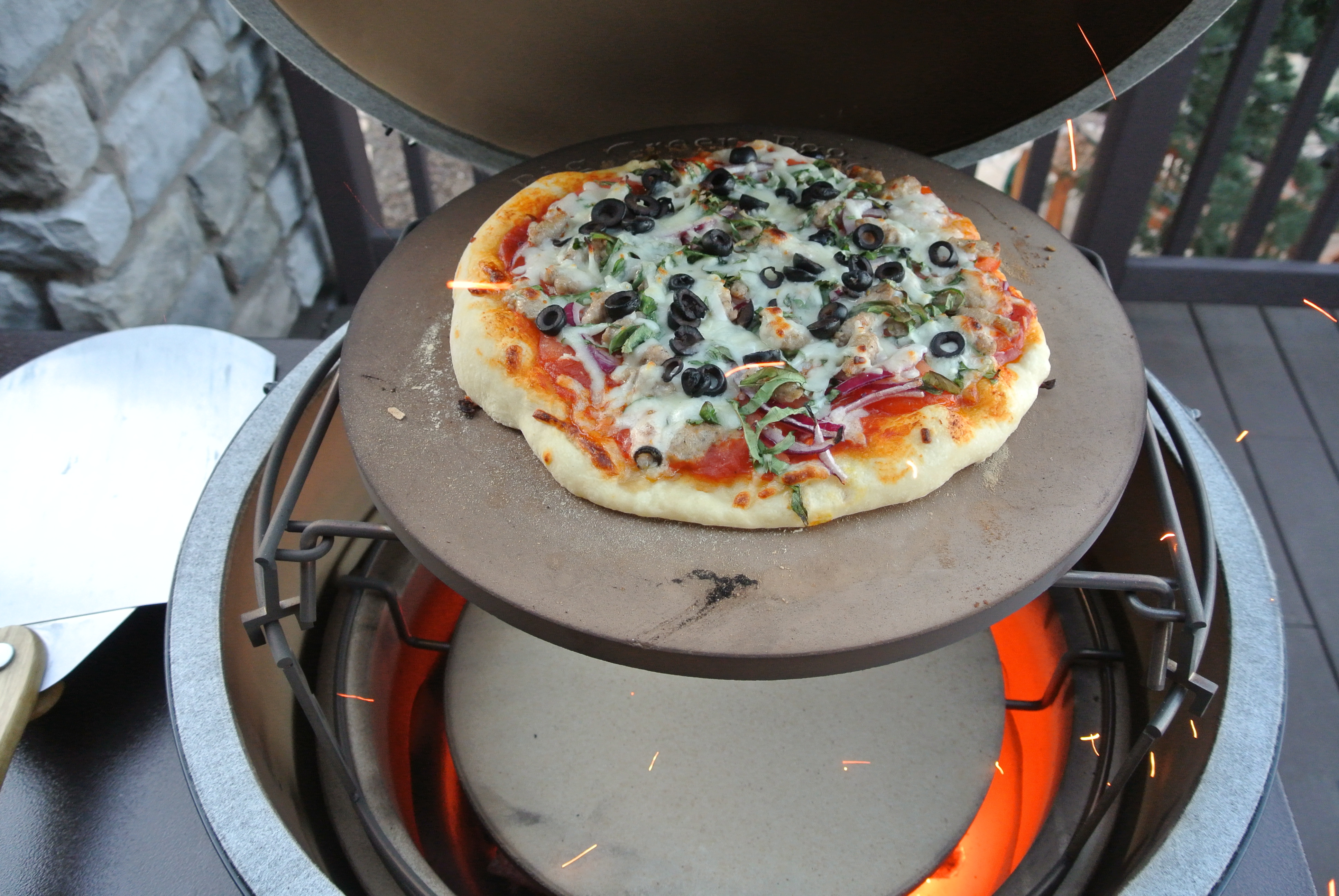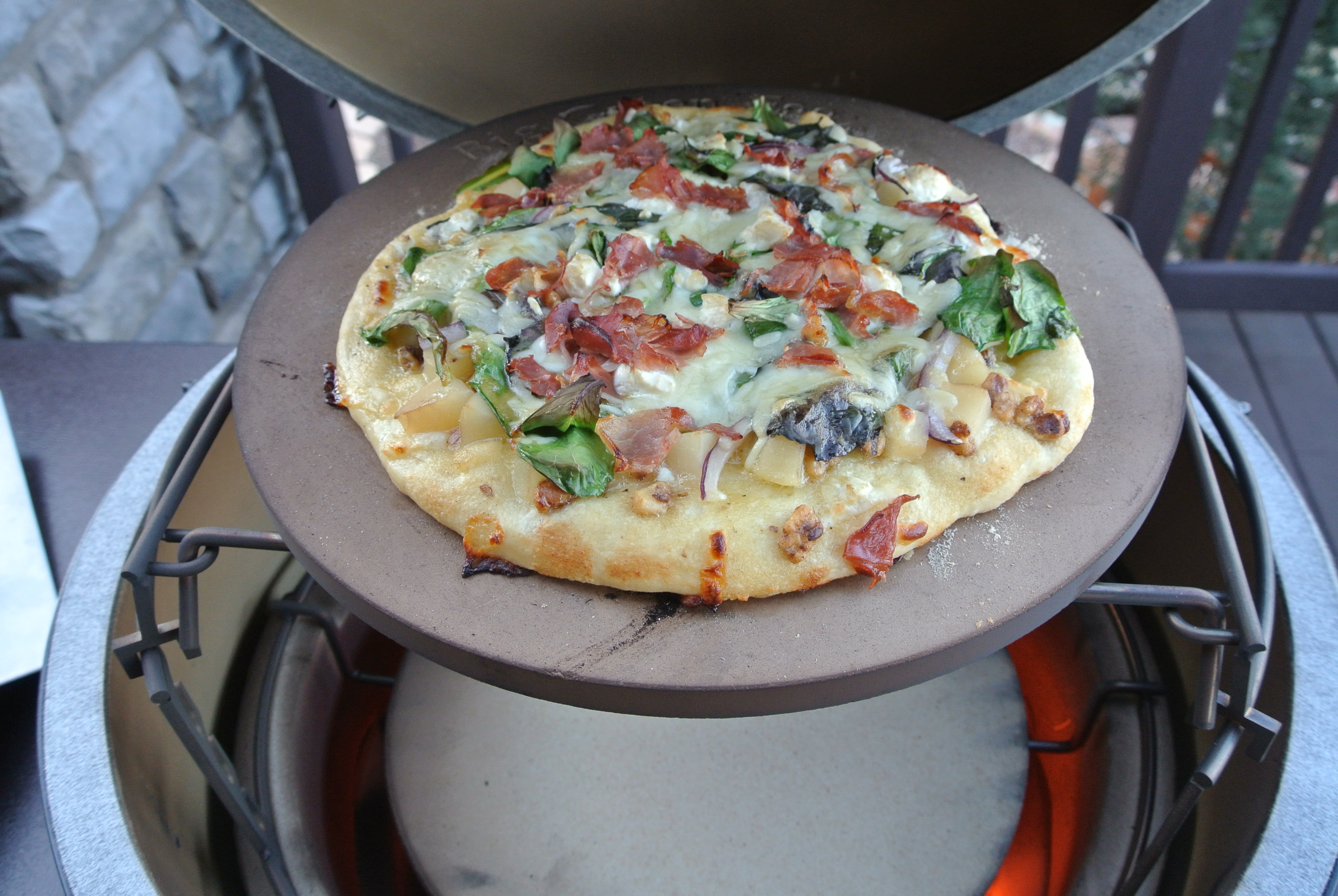Did two pizzas tonight, one was a converted salad my wife makes with pear, shallots, red onion, candied walnuts, and a dressing with apple cider vinegar and dry mustard. The other was a family standard fresh tomato, basil, red onion, black olive, and garlic olive oil. The egg performed perfectly. I cooked the pizzas between 550 and 600. Got there quickly and held temp with no trouble. Here are some pics, and the recipe for the pear pizza, It is really very good.