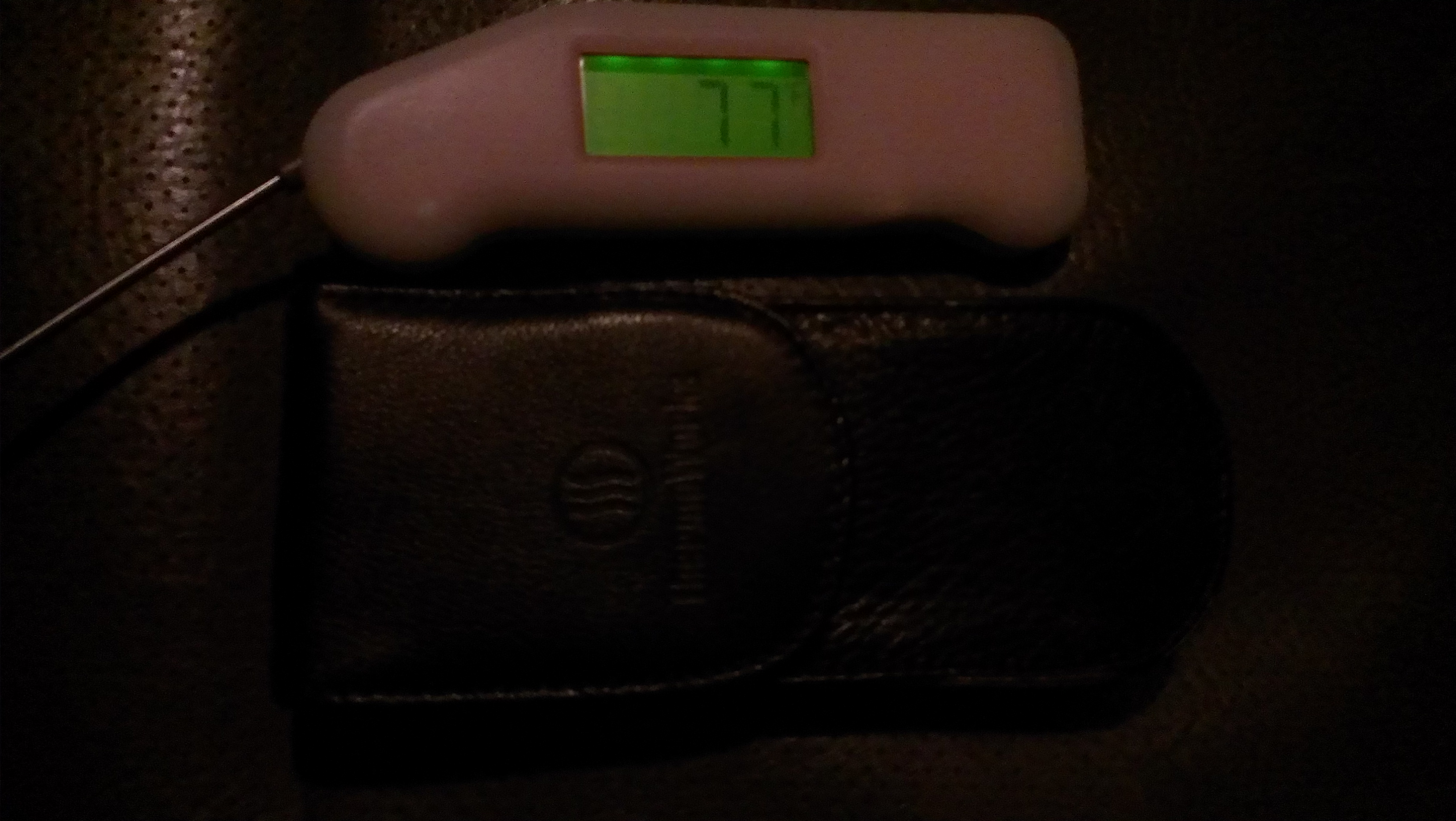 It's official I've got my Thermapen with glow in the dark silicone magnetic boot and leather wallet carrier. Hard to see but even when the boot is glowing the display will light with low ambient light. Obviously the backlit LCD may go out when ambers to the egg are glowing as it is sensitive to save battery life. Can't wait to use this bad boy!