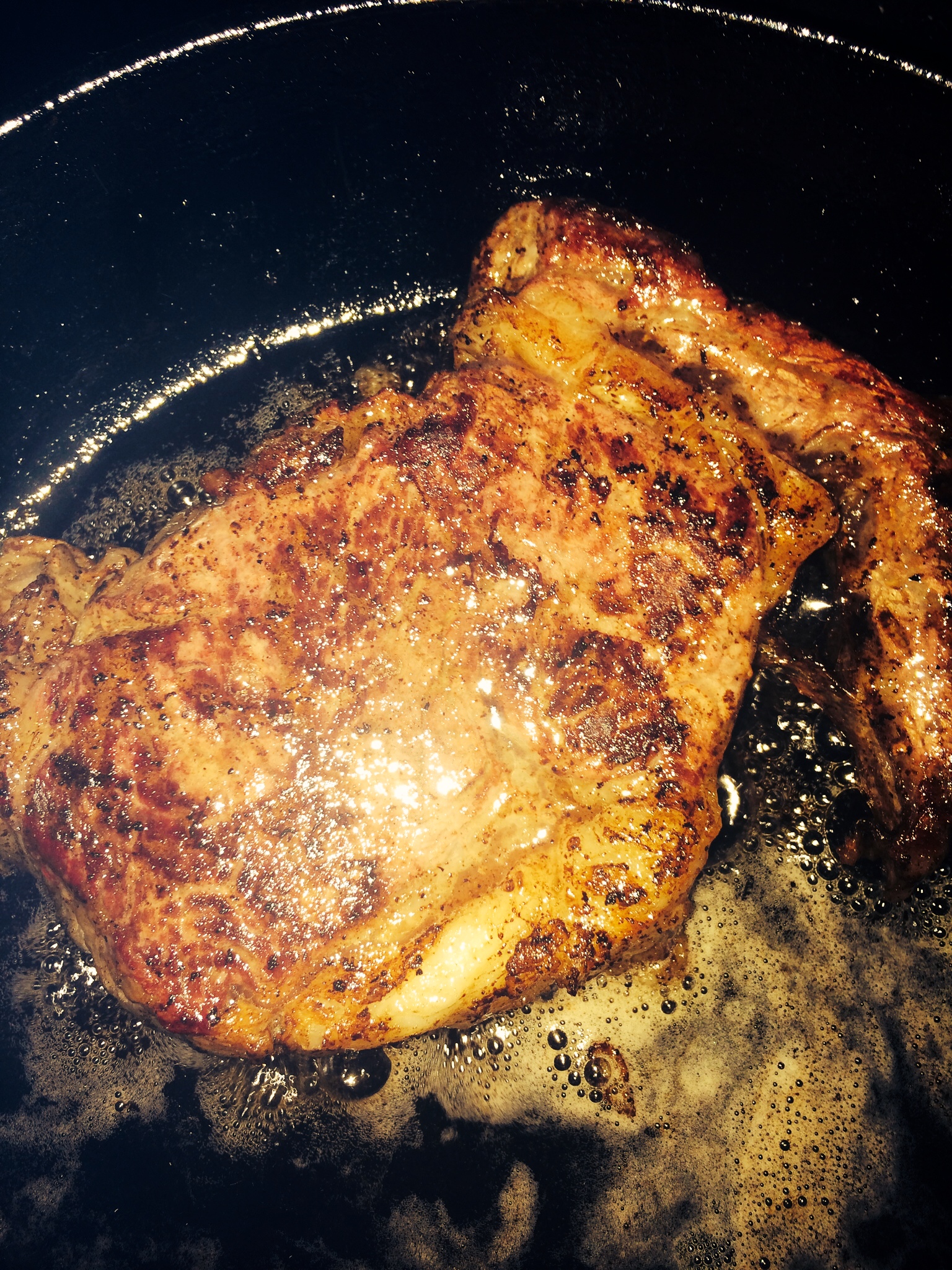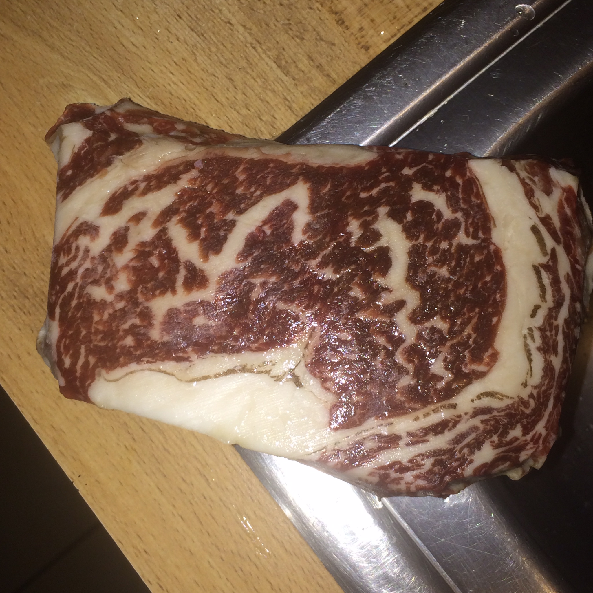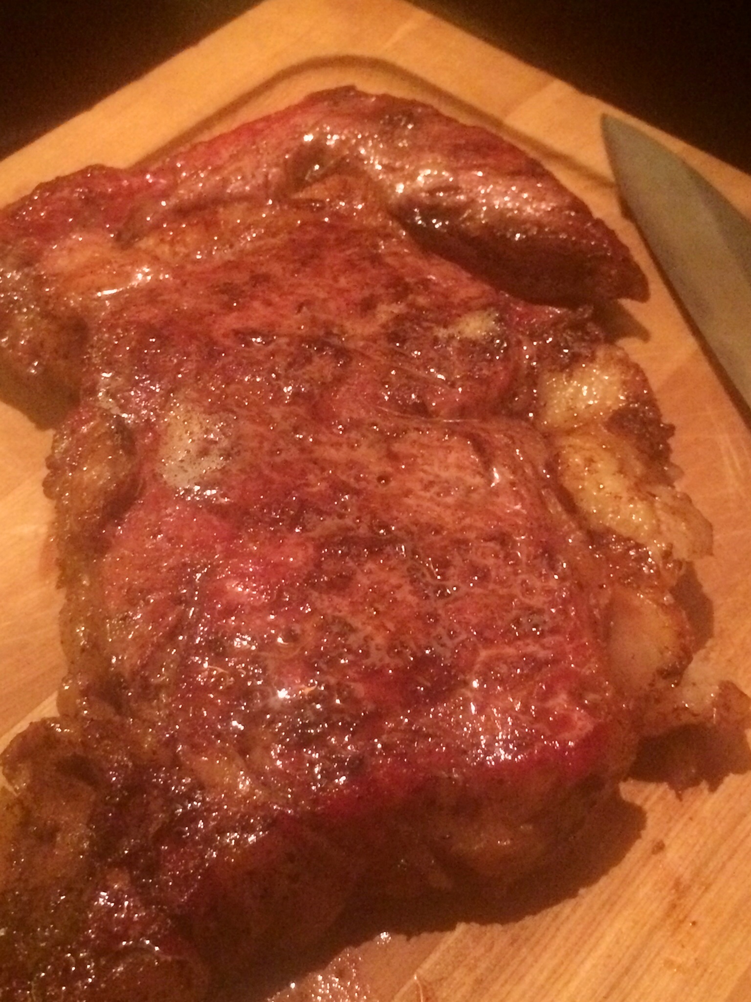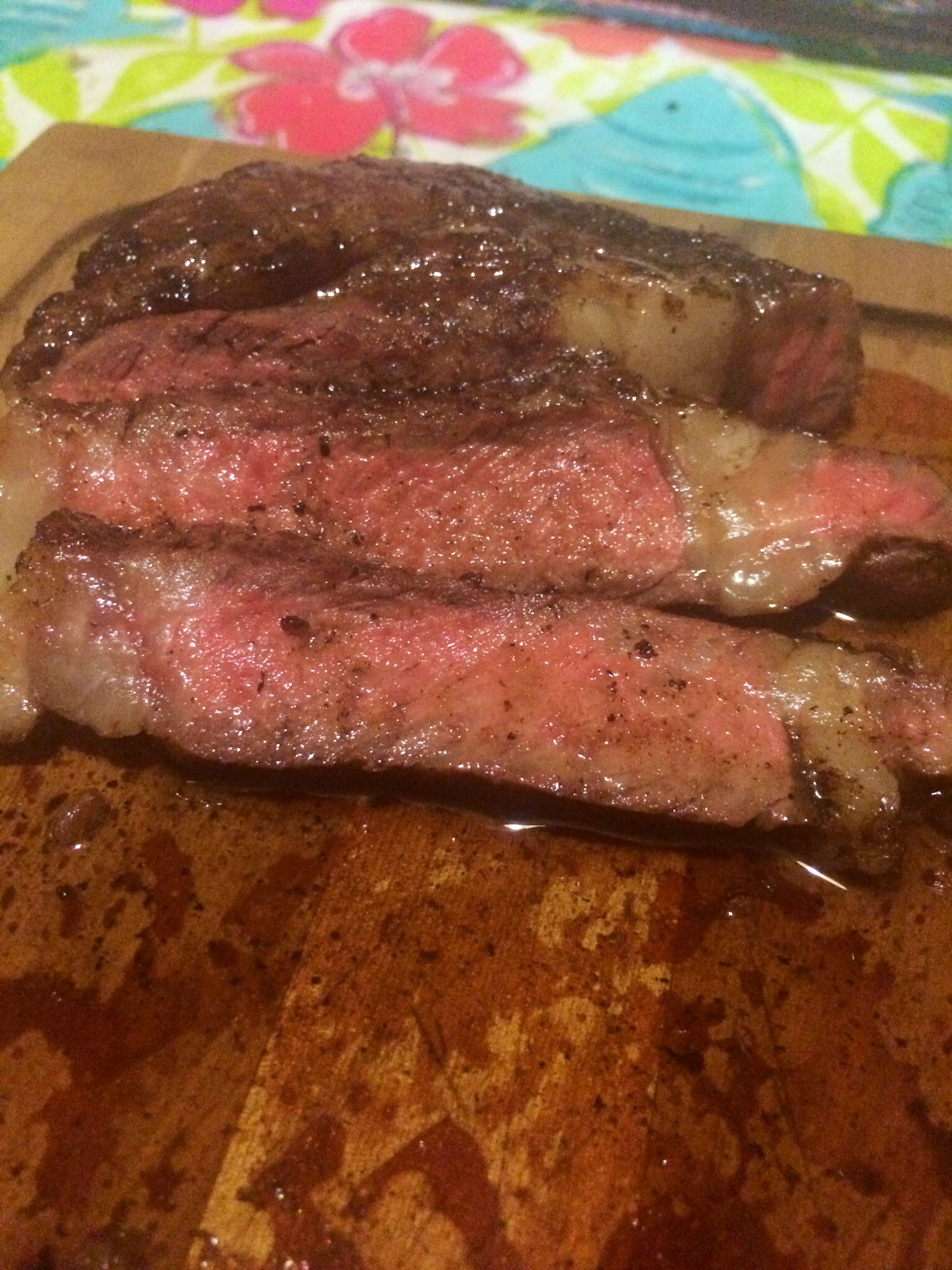 + Seared the steak for 1:30sec per side. Angled the skillet about 45* and took a large spoon to baste the steak in the steak juice and butter, while searing.
