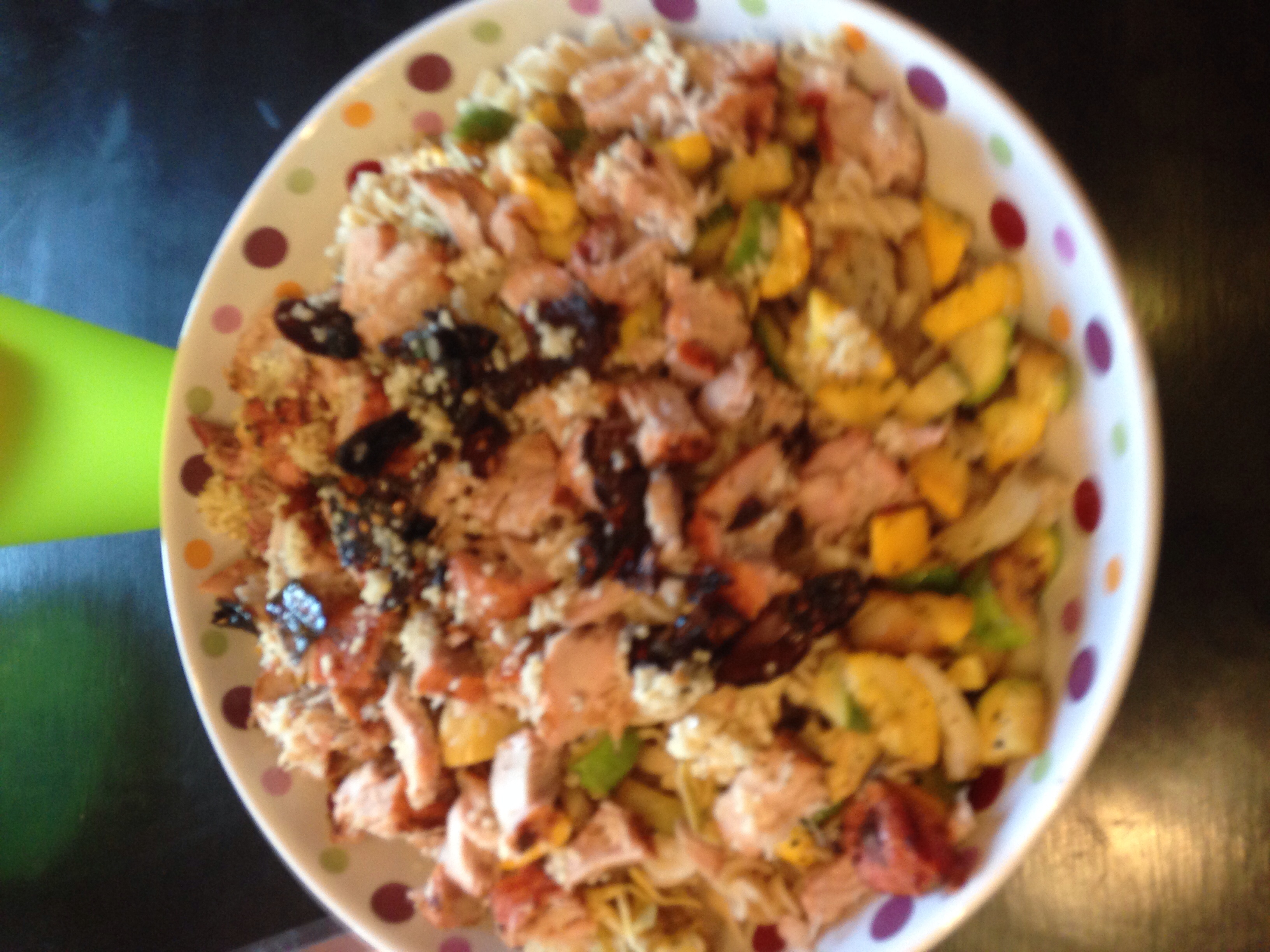 Grilled tuna steaks. Plus grilled onions, zuchs, squash, artichoke hearts, and sun dried tomatoes. Very delicious finished off with a garlic and lemon sauce.