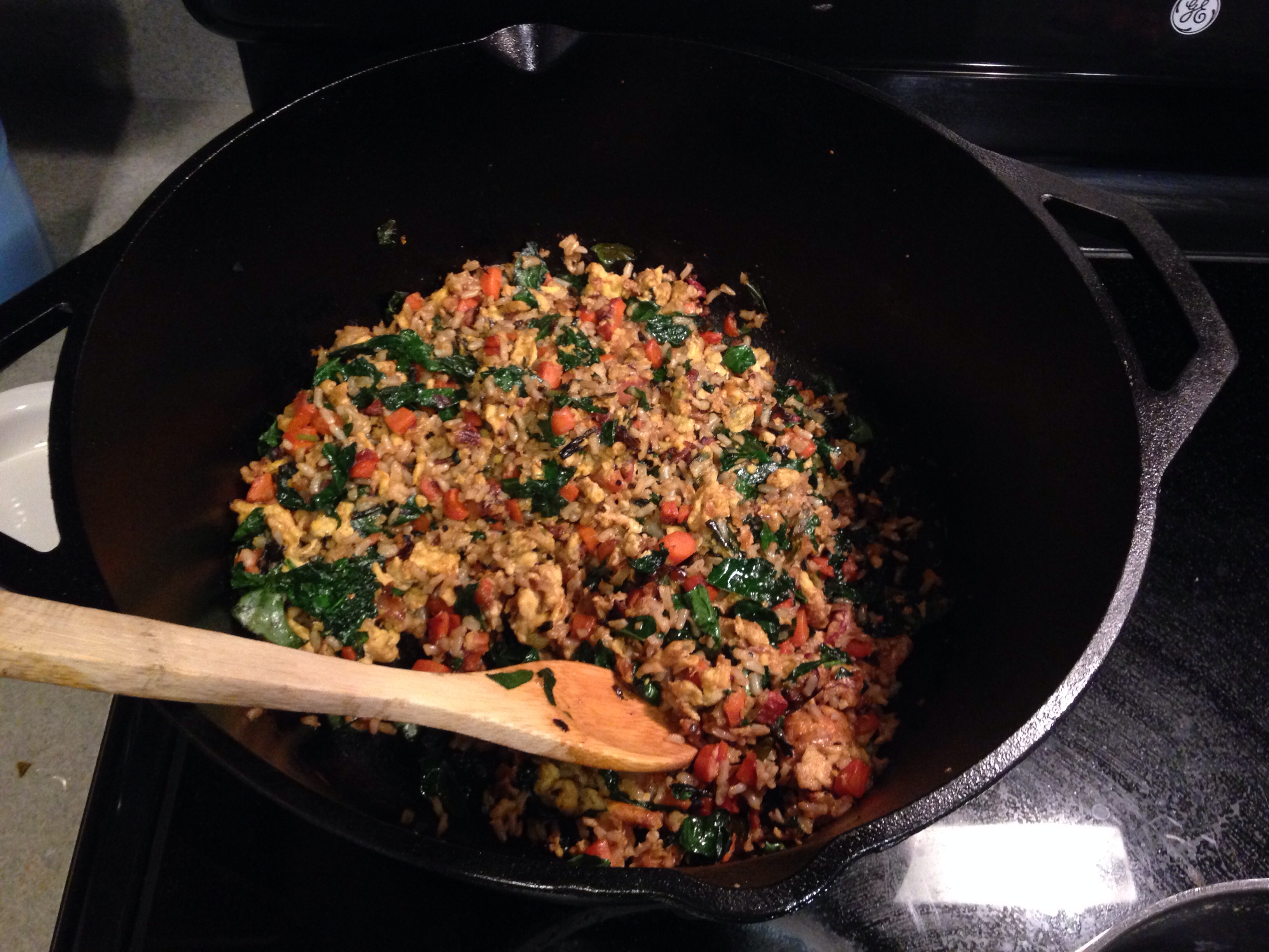Threw together some fried rice tonight. Didn't have all of the usual stuff so I used what I had. Fried rice with kale, carrots, radishes, and spring onions. It was pretty darn good. Cooked it in the DO direct at 500.