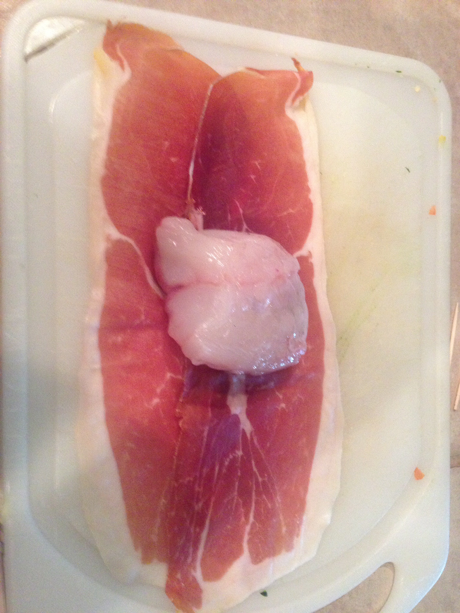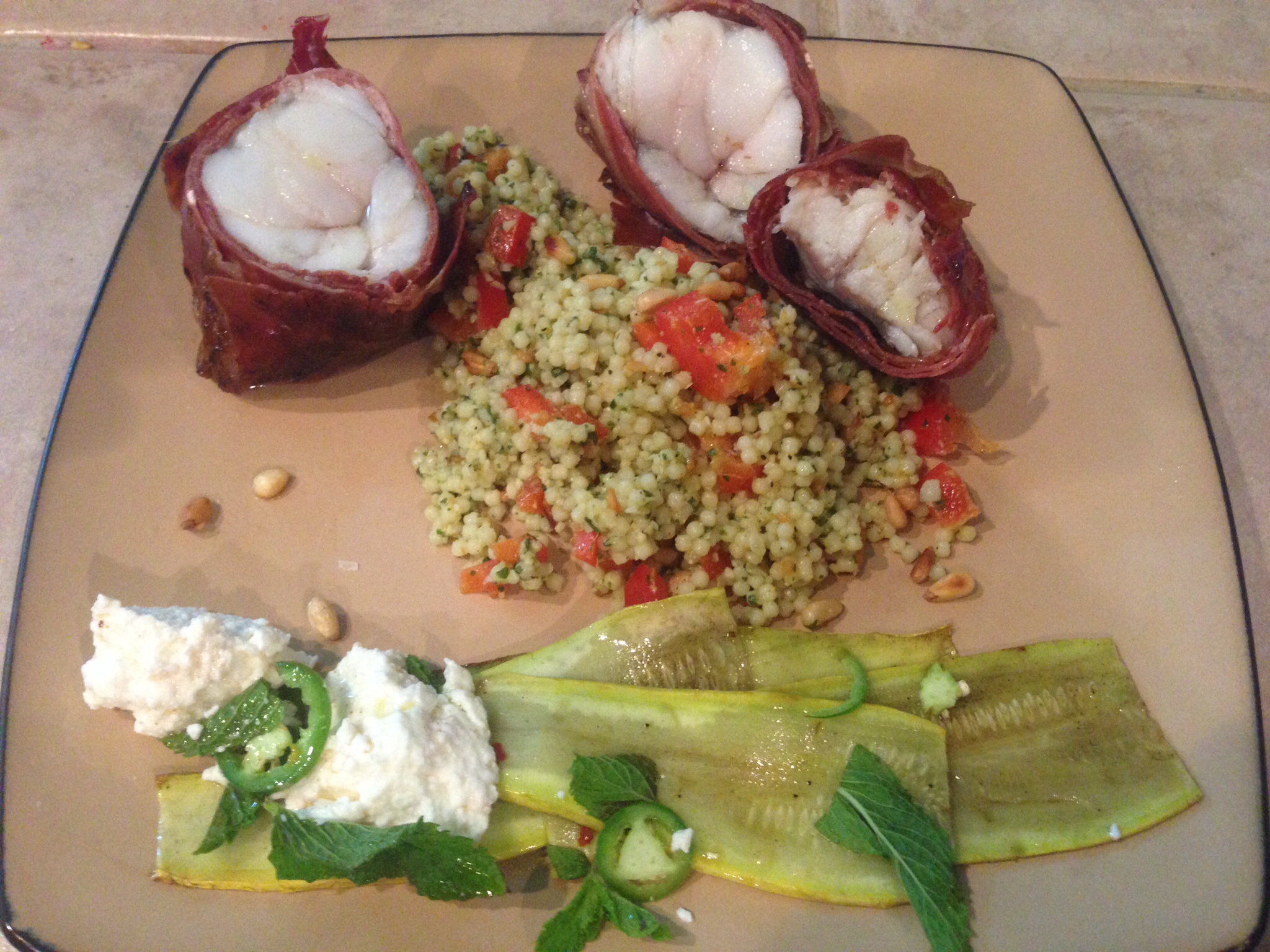 Oh yeah! Monk Fish Wrapped in Prosciutto; acini di pepe with homemade pesto; marinated squash.
