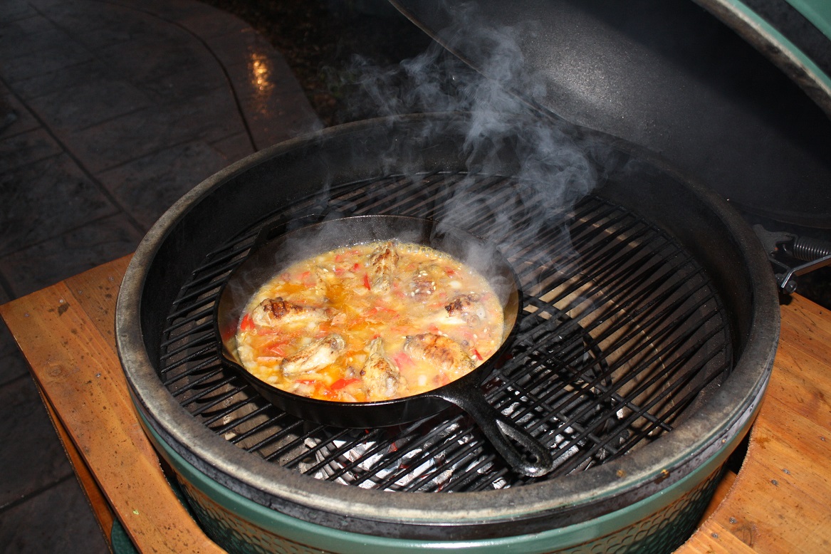 Due to travel, weather, and various commitments, I have not been egging nearly as much as I would like lately.  Wife is away this weekend and I decided to do a small batch of paella using some odds and ends from the freezer.  My Paella pans are pretty big (14 and 18") so I decided to use a cast iron skillet for this cook.  Chorizo, shrimp, and chicken wings for the protein.  My son decided to hang with me for the afternoon, so it was a joint effort.  The forecast was crap, but the sun was shining at 6:00 so we fired up the egg.  By the time it was up to temp, we had rain and wind, then thunder and hail!  Can't we have one good day on a weekend?
