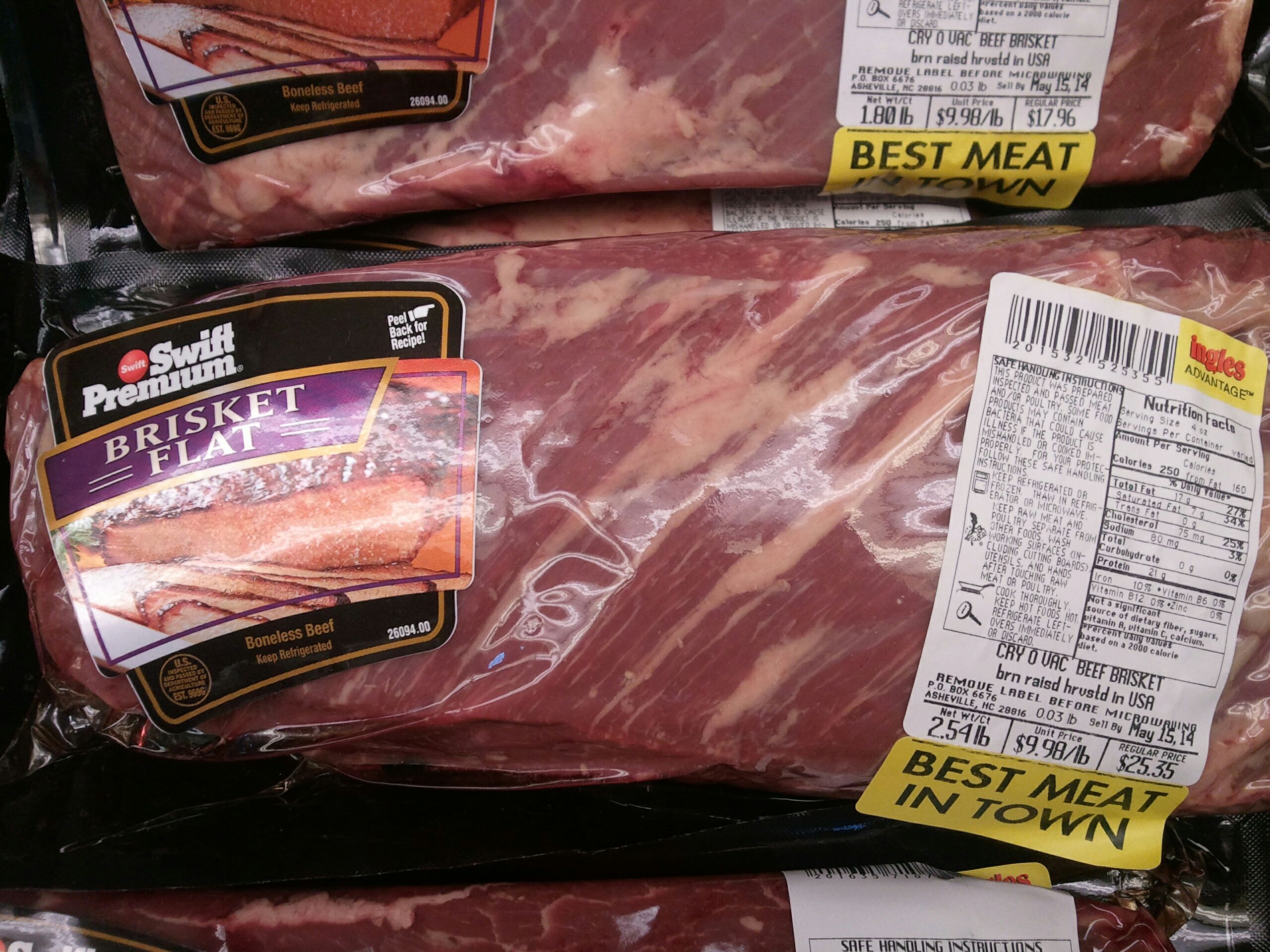 I was just at our Wal-Mart and they had whole packer Select grade brisket for $3.28/lb. If I remember correctly, a couple weeks ago I got a Choice packer from Restaurant Depot for $3.87/lb or so. If I was going to egg the flat in your picture, I would probably go Travis style.They/Them