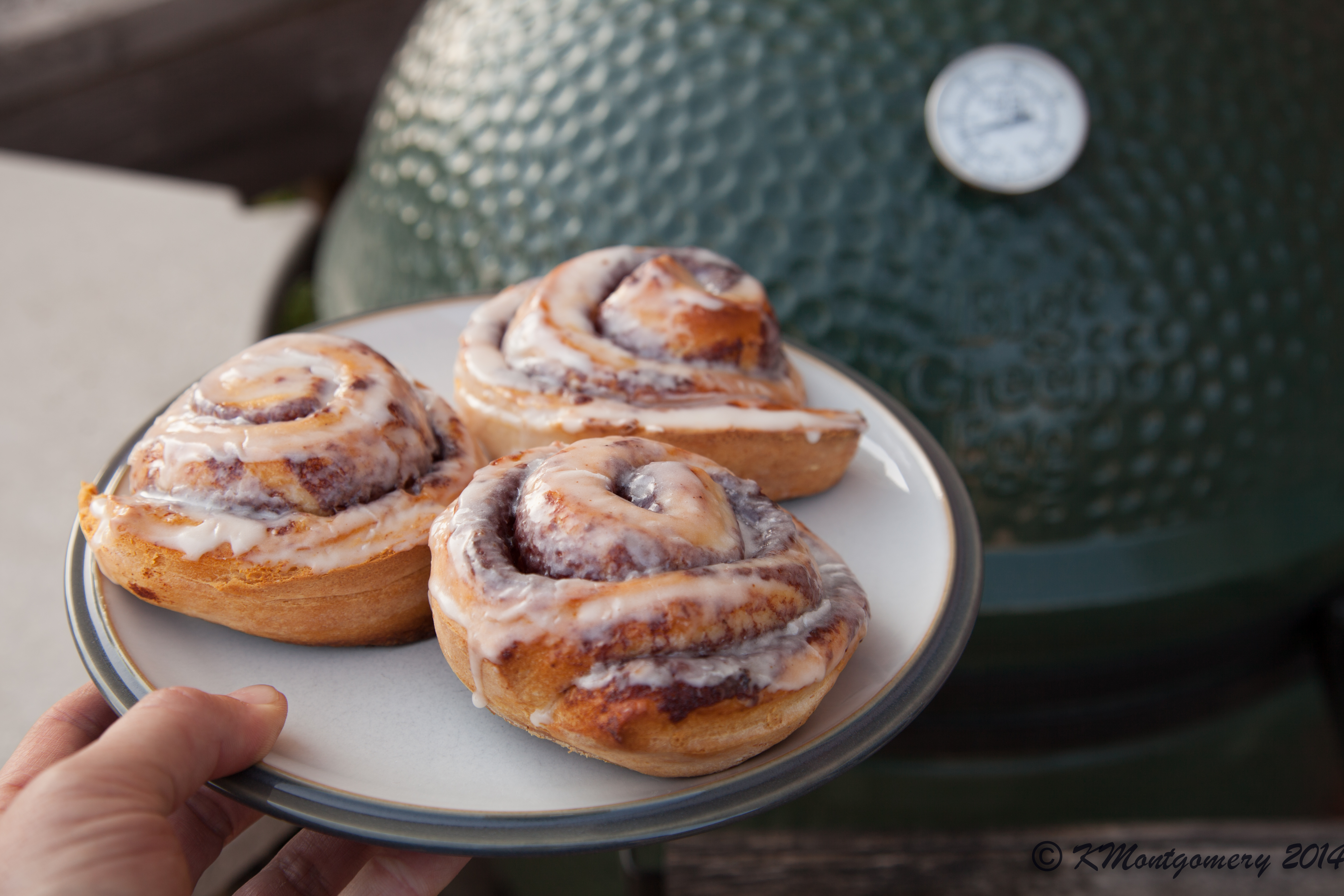 I had been using the Egg all day and once I closed off the vents, I took advantage of the free heat that the Egg would have for the next couple hours and did up a batch of Cinnamon Buns. I greased up a cookie sheet for this cook, but I have done them on the plate setter (legs down) as well in the past with either foil or parchment paper. I put them on while the egg was at 370* ish and the cooked for 28 minutes. There was no wood smoke left in the Egg, but the natural charcoal smoke just gave it a nice aroma. Once they started to golden up I removed them and the temp was still around 350*.