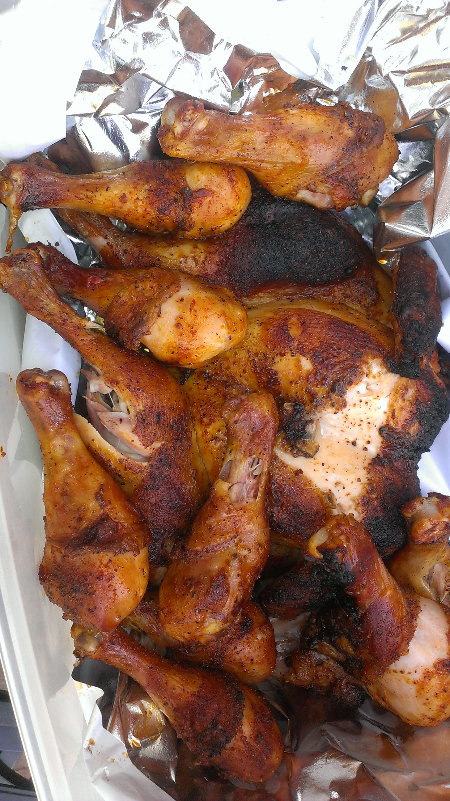 I don't live that close to a power plant it is one whole chicken and 10 extra drumsticks. My son likes them the most. He had two tonight for dinner. The chicken was good, but I think the extra smoke was noticeable in the favor, but not enough that they didn't taste good. I learned that next time I am going direct next time and I didn't put enough brown sugar in the brine. It was very juicy. Here is my set up on the egg today.XL, WSM, Coleman Road Trip Gas GrillKansas City, Mo.