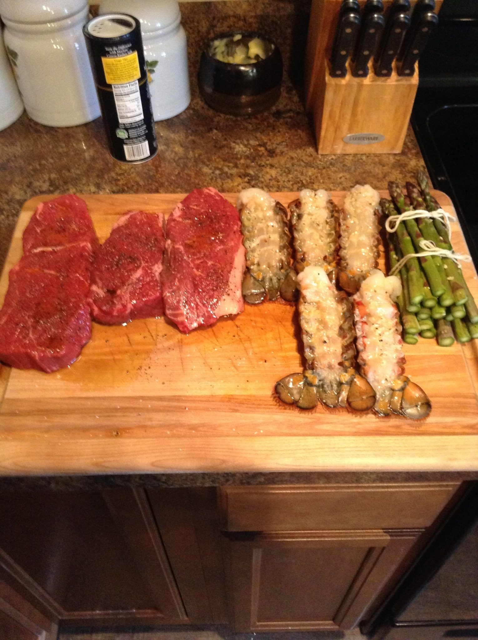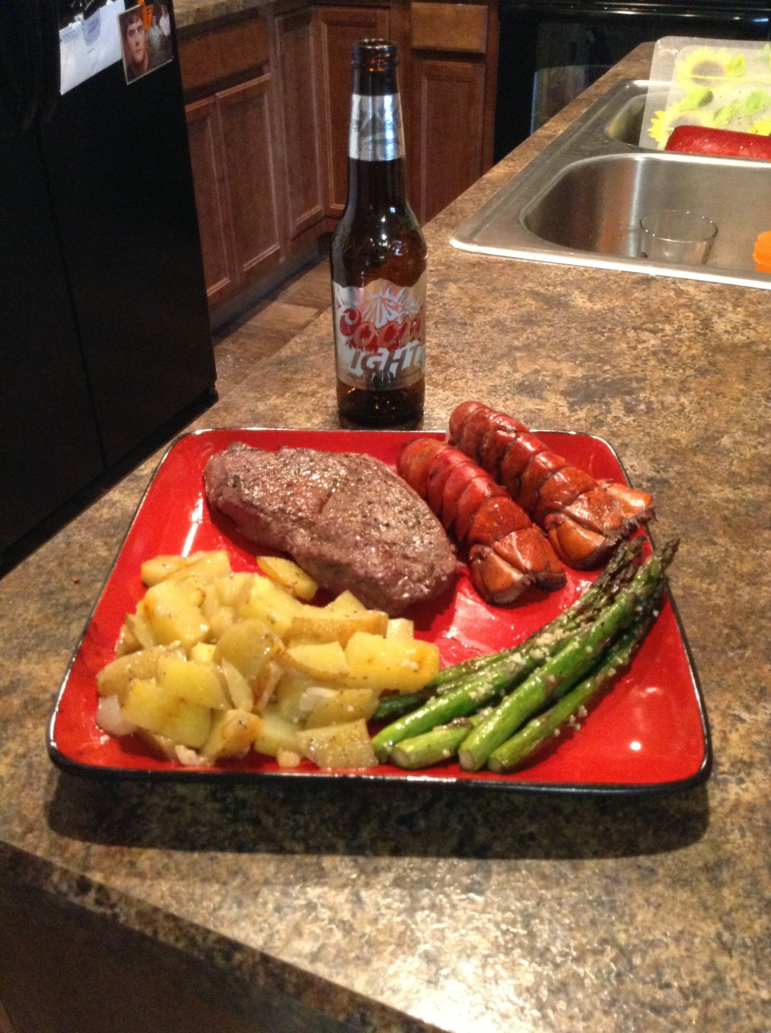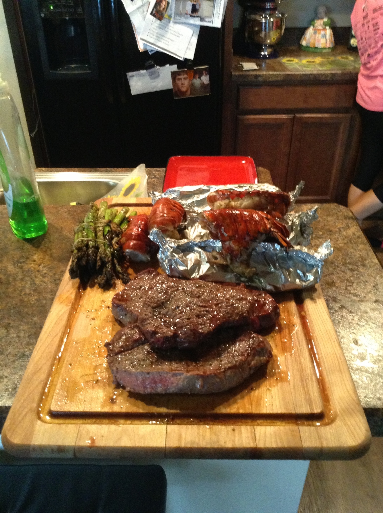 Just got my bag of Rockwood I ordered online (gotta say I really like it). Can't get WGWW anywhere near me so after reading about Rockwood on the forum I decided to order some. Did steaks, potatoes, asparagus and lobster tails all of them direct at 500 at different intervals paying close attention to the asparagus. Searing the steaks for 2 min/side works great for the family as we all like our steaks rare. After uploading pics realized I didn't take a picture on the egg. Next time SWMBO said there will surely be a next time.